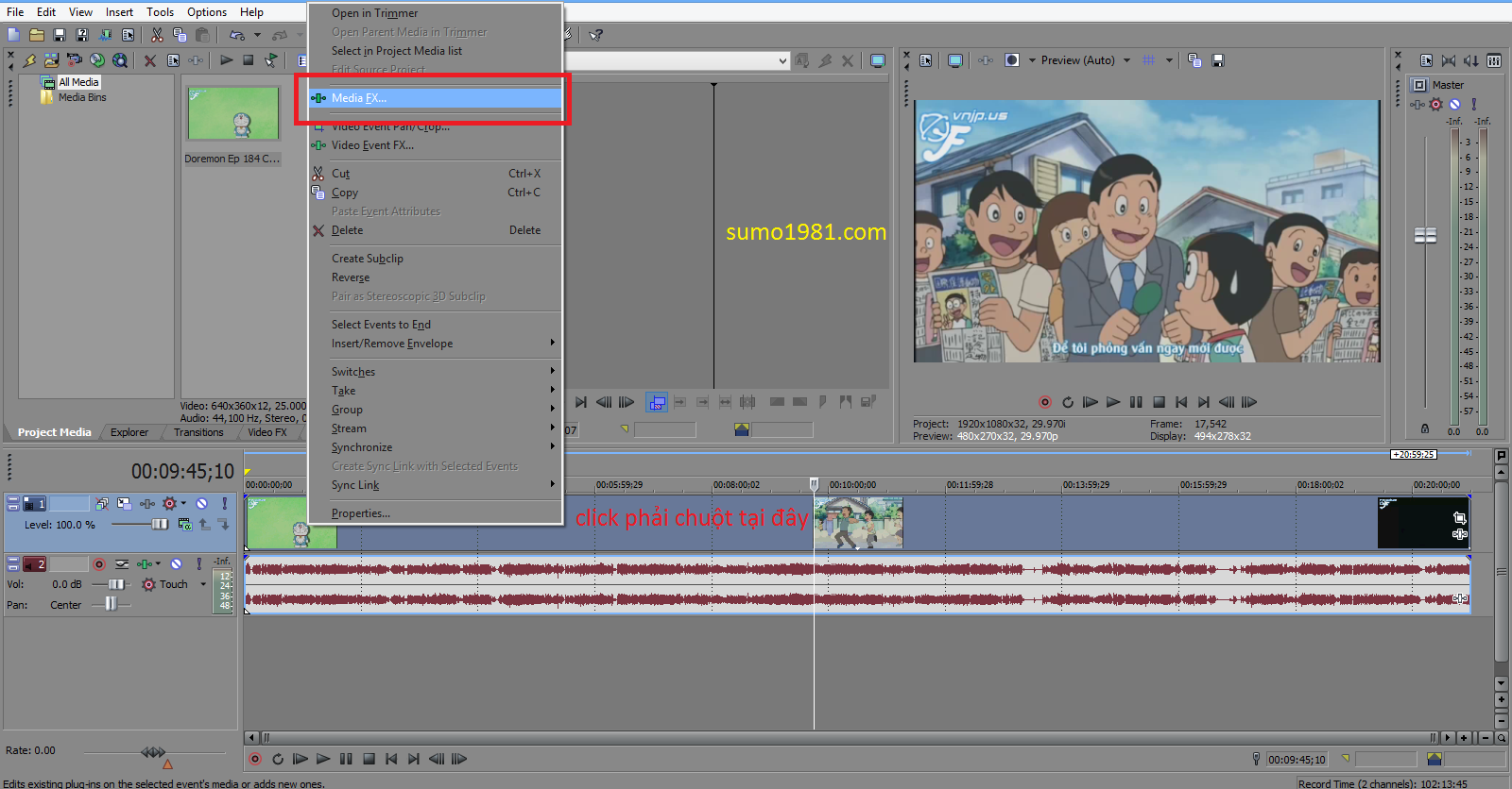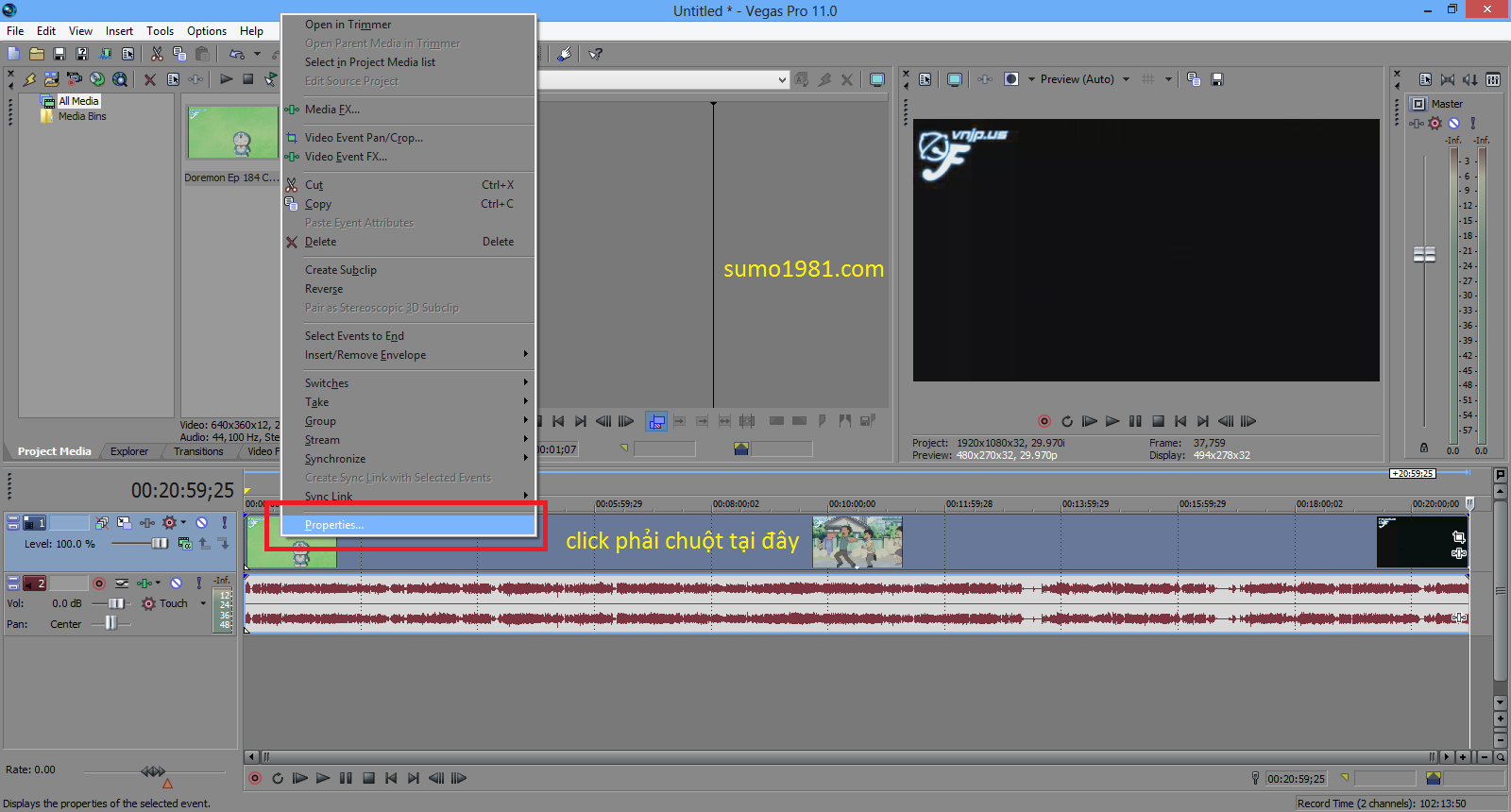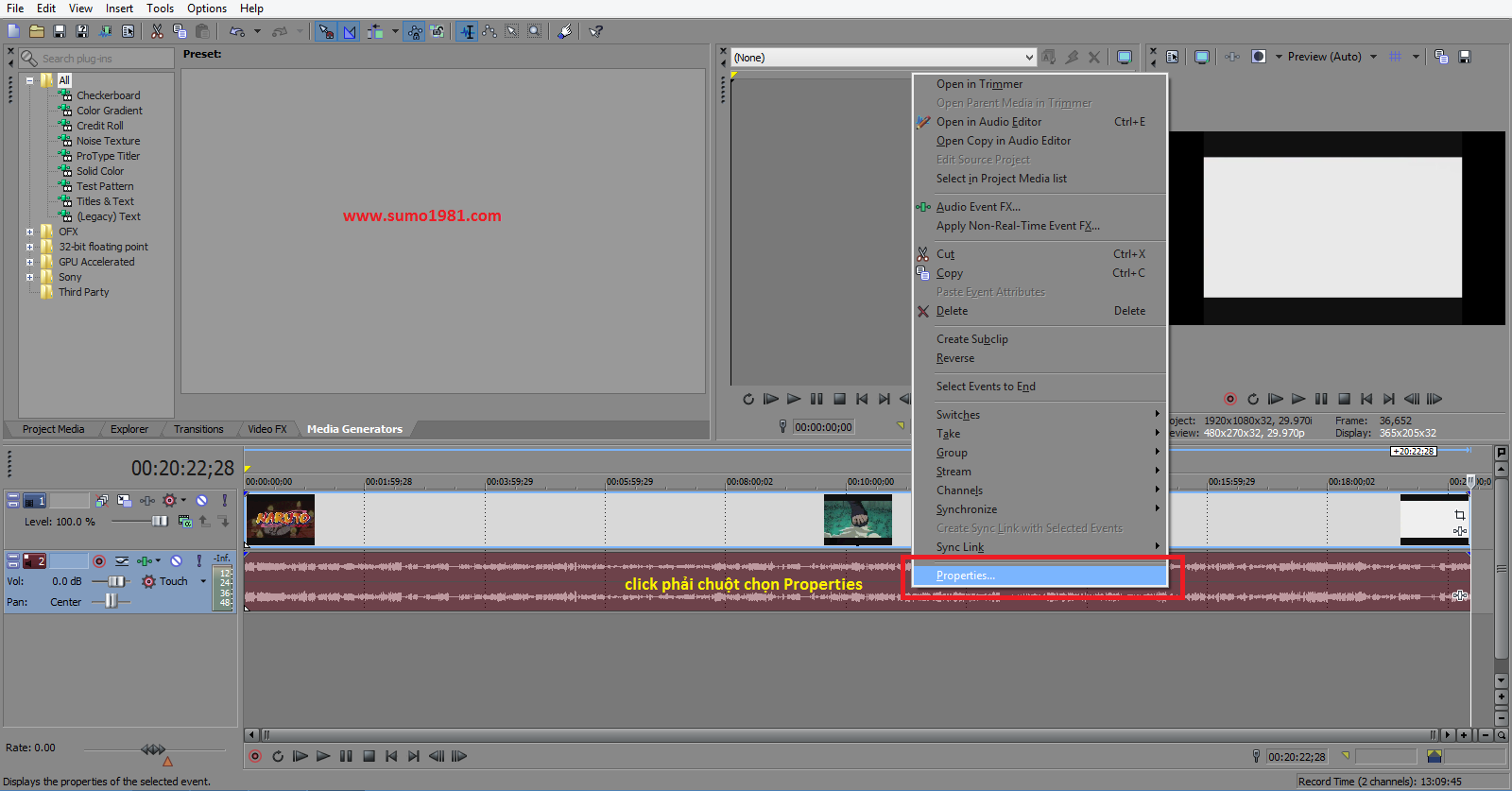 Bước 3/ Tiếp tục click phải chuột vào khung video, chọn Properties, Chọn Media FX