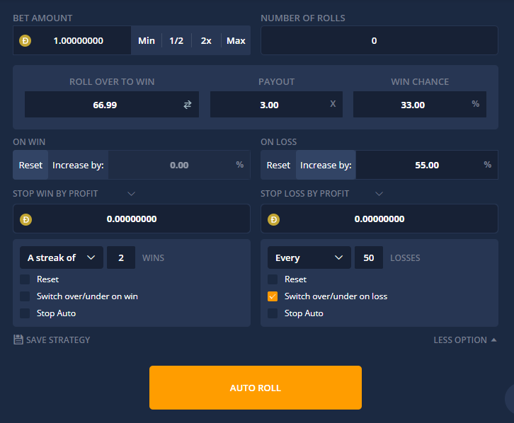 Thông số AUTO DICE cho ae kiếm cơm với vốn là 5000 DOGE (Vốn nạp nhiều hơn 5000 DOGE thì x tiền cược lên. VD nạp 50.000 DOGE thì *** AMOUNT đặt 10 DOGE)