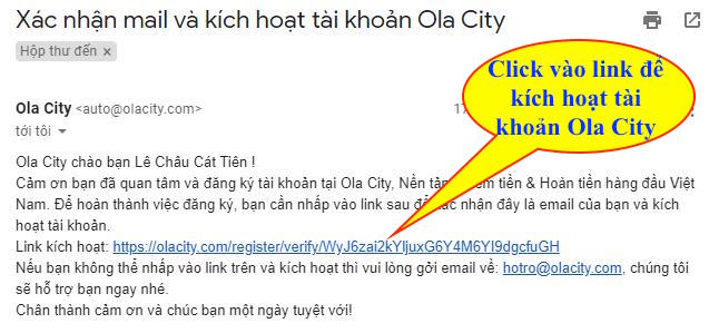 Kiểm tra ngay email vừa đăng ký để kích hoạt tài khoản. Bấm vào link gửi qua email để xác minh tài khoản và đăng nhập vào hệ thống quản lý của Ola City.