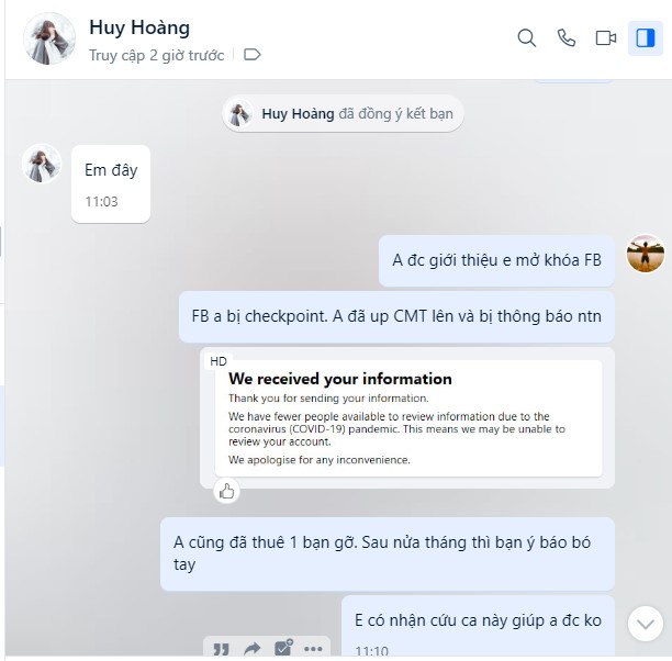 Mà cái kiểu khóa này của fb thì có hi vọng lấy lại không vậy a MOD. Bạn em nhiều người bị như này, gửi doc đầy đủ cả nhưng ko thấy phản hồi.