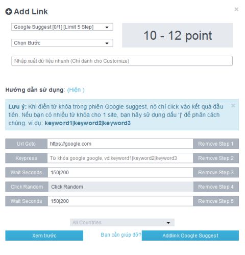 Google Suggest : gần như tương tự với Google Normal, chỉ khác ở chỗ phần mềm sẽ click vào từ khóa đầu tiên trong khung gợi ý từ khóa của Google. Bấm vào Addlink Google Suggest để kết thúc cấu hình.