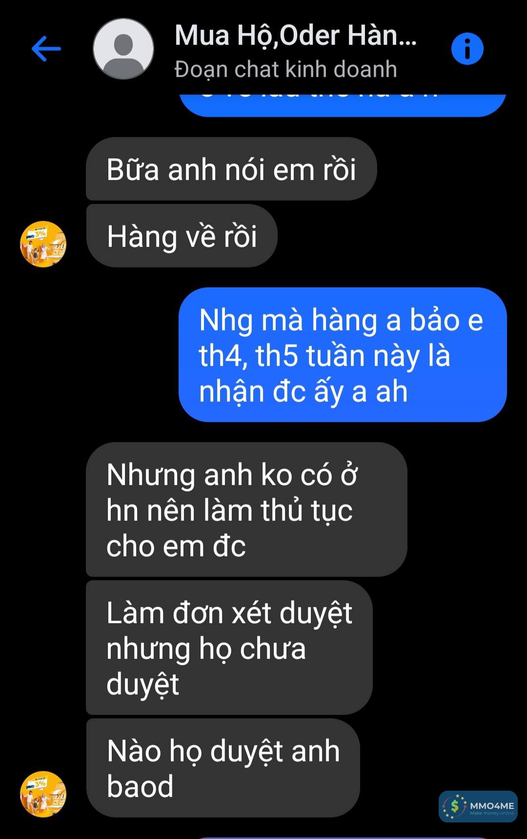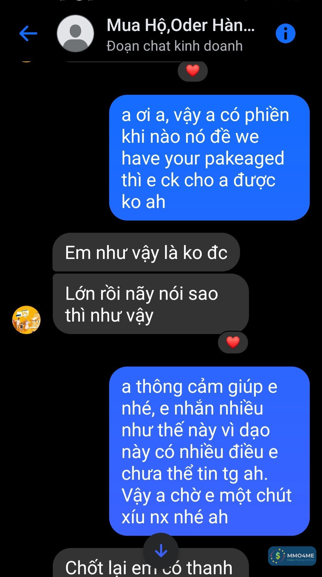 Ban đầu mình thấy đây là đoạn chat Kinh Doanh, có gần 4K theo dõi, và có đề địa chỉ ở Đà Nẵng. Mình search ko ra nhưng nghĩ mình ko ở Đà Nẵng nên ko biết nhà ở đó nên vô tình lại chủ quan. Khi mình hỏi về dịch vụ mua đồ hộ bên Mỹ thì trang trả lời nhiệt tình rồi bảo mình cọc 20%, biết tracking thì trả 50% và rồi nhận được hàng thì trả nốt. Lần đầu mình đặt nên mình cũng tin nghĩ là hàng Mỹ nên cọc là đúng nên cũng đã ck cho đối tượng, mình mua khoảng 3 triệu tiền hàng nên cọc lần lượt hơn 500k, 1tr và hơn 300k ( lần 2 mình tách thành 2 lần).
