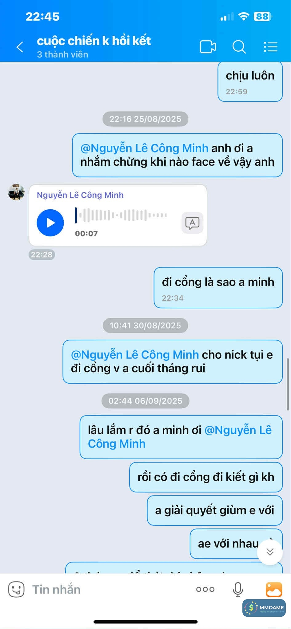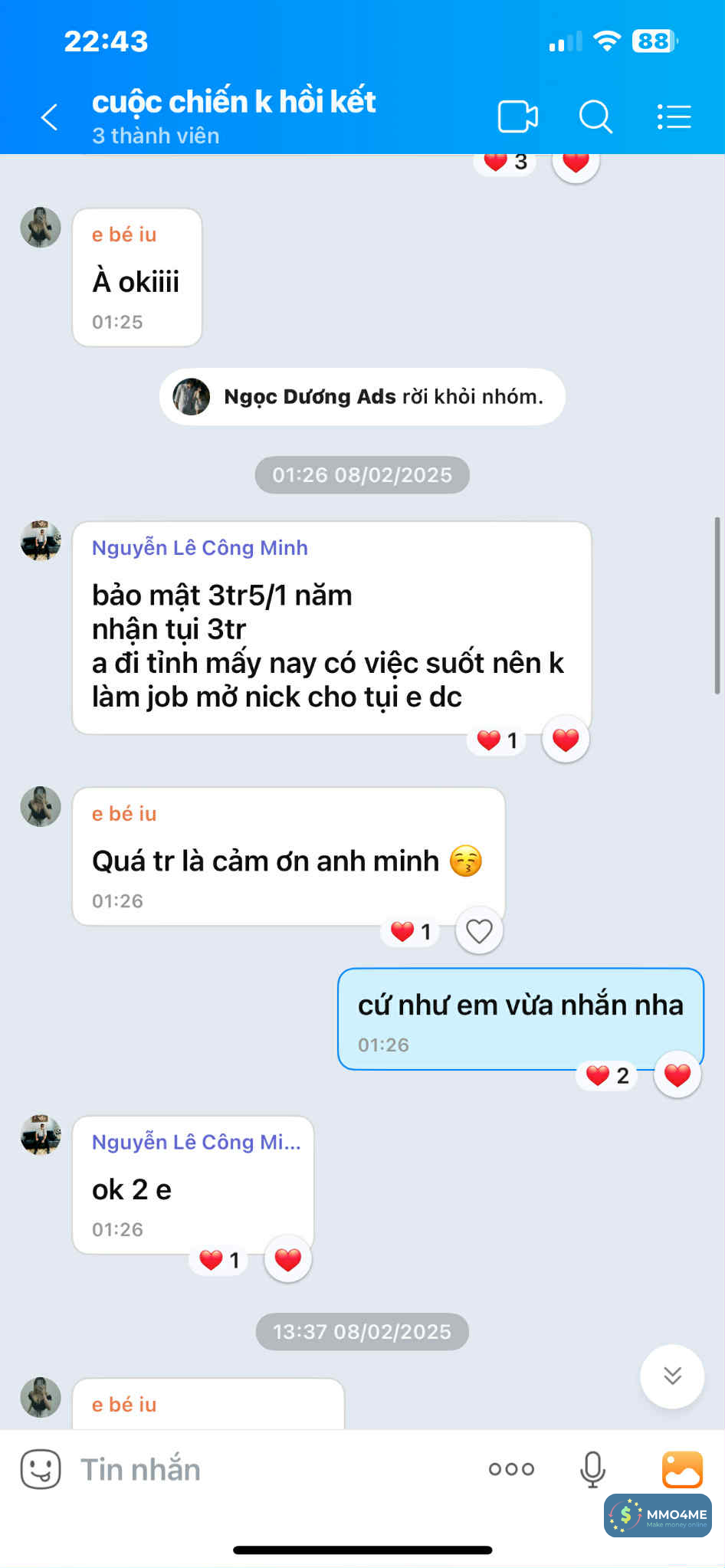 - Mọi thứ chuyển khi bản thân mình thiết kế sinh chu hỏi rất nhiều nơi là acc này có phải nặng không mà tận 2 tháng do Minh bảo là support của Face bị treo nên phải chờ , và mình có tiếp thông tin của bạn D về việc Minh tính giá làm với ae (Chuyện này không quan tâm vì kiếm tiền ai cũng vậy nhưng mà là anh em với nhau cả , biết nhau khác cũng làm xe nhau và tất nhiên lúc đó rất )