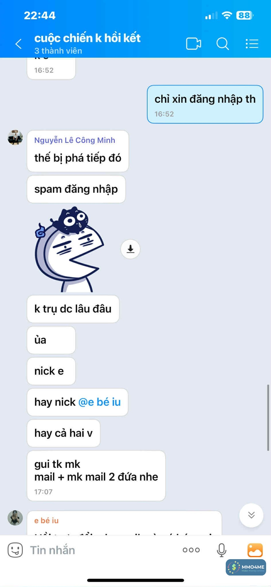 - Tới tháng 7 nhóm mình cả 2 bị mất nick và nhờ Minh lấy về nhưng 2 tháng không tìm thấy đâu ( Phản hồi rất chậm , hoặc hái cây mới đại diện )
