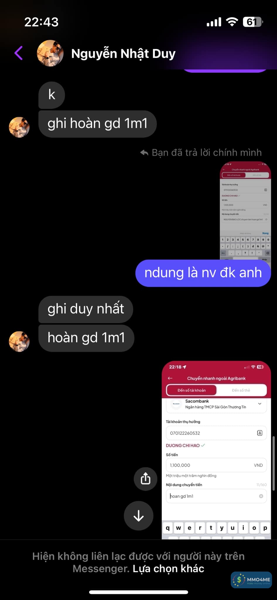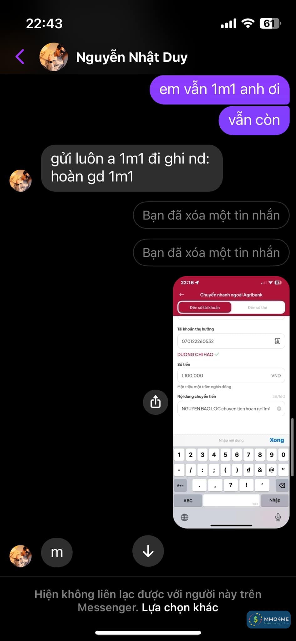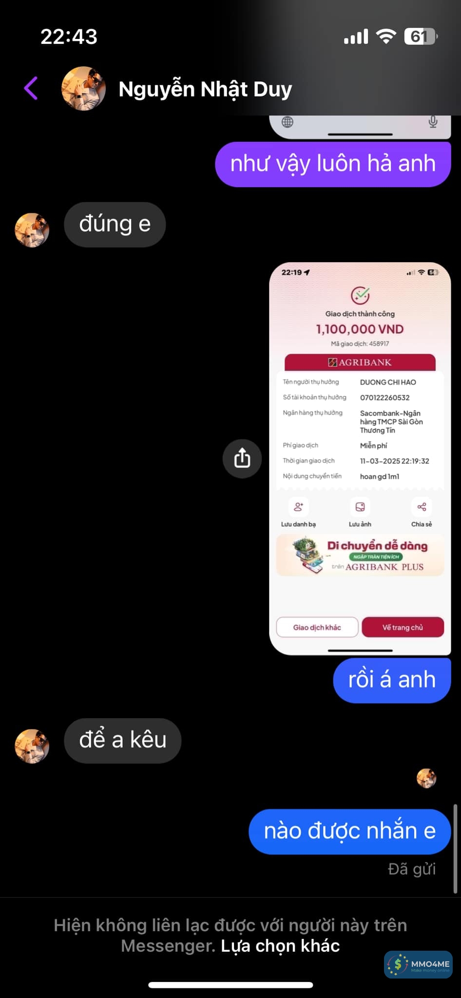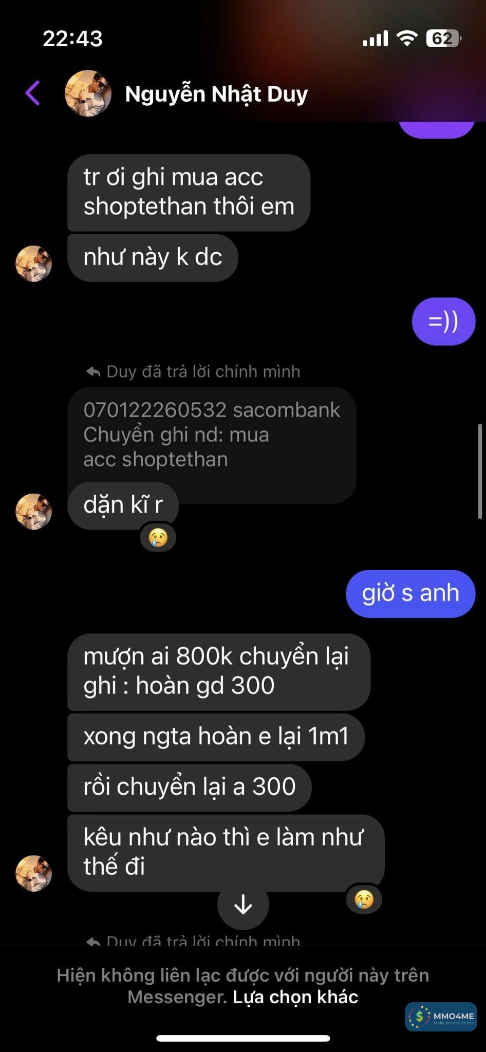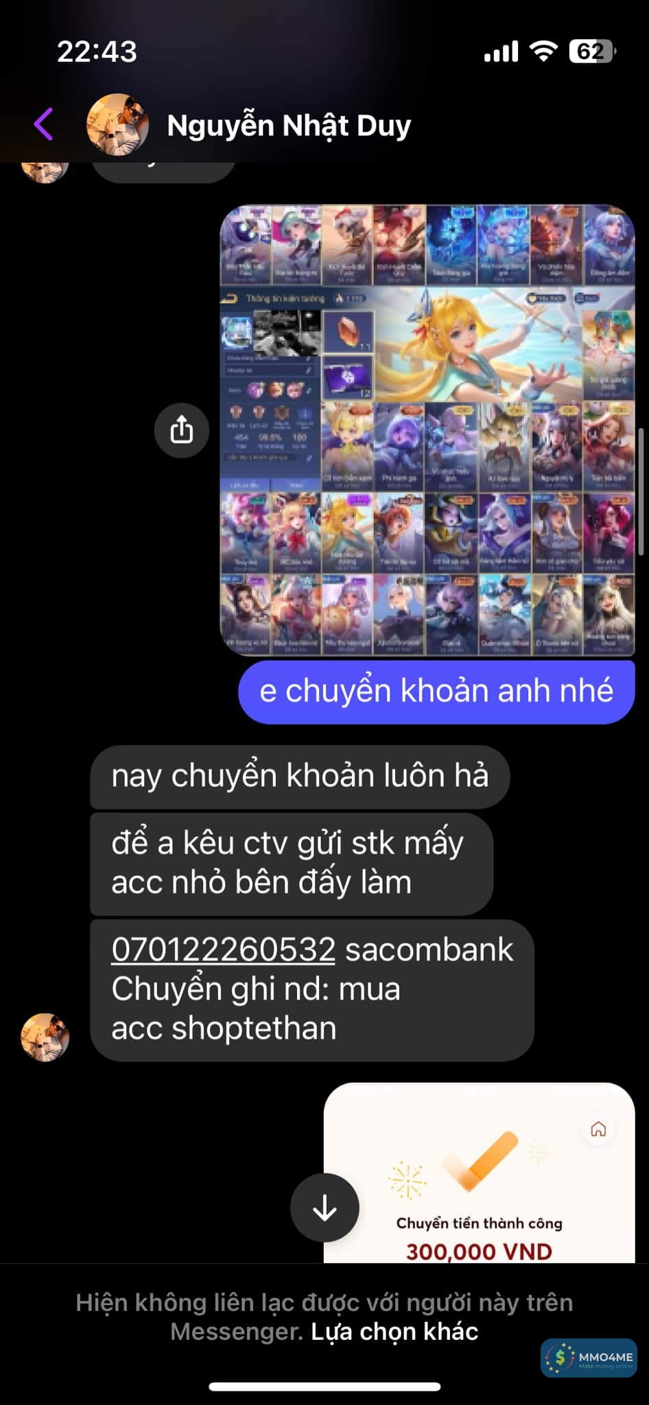 góc bốc phốt: Chuyện là mình kbt đây có đúng là tề thần kh nhưng mình đã bị scam 2m2 chuyện là b ấy hỏi mình có muốn acc kh mình bảo có tại mình cx muốn chơi lại thế là mình mới bảo gth cho mình con acc nào 300k thì mình ck xong lúc đó mình công nhận mình ngu mình kh theo đúng gdich bạn ấy bảo mình hoàn mình cũng làm theo ( đhs lúc đó ngu quá ) xong một hồi thì mình cũng chuyển thì mình cũng quên giao dịch lần t2 b ấy bảo mình chuyển nốt 1m1 mình cũng chuyển và làm theo đúg với giao dịch . Một lúc sau mình check lại thì b ấy đã chặn mình r mình cũng dùng acc clone để ntin và cx bị chặn