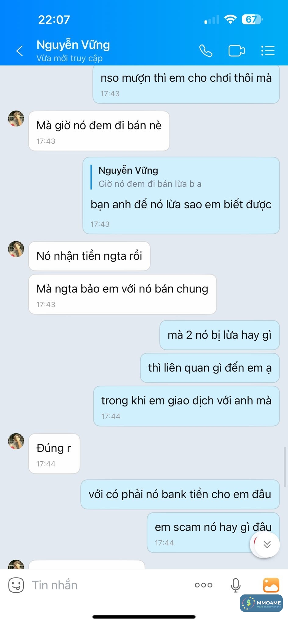 - Xong rồi gọi nch gquyet em ms bt Lý Trầm Khê có bank tiền cho bạn em để mua tk đó mà lúc giao dịch thì không ai nói với em và em cũng không bt cuộc gd này, em là chủ acc mà LTK lại gd vs bạn em , LTK bị bạn em scam rồi qua kêu Ken xích acc em trong khi em có scam LTK gì đâu, em mới bảo anh bank tiền cho ai thì anh tìm ng đó giải quyết chứ em có scam đâu mà xích acc em rồi bắt em chịu