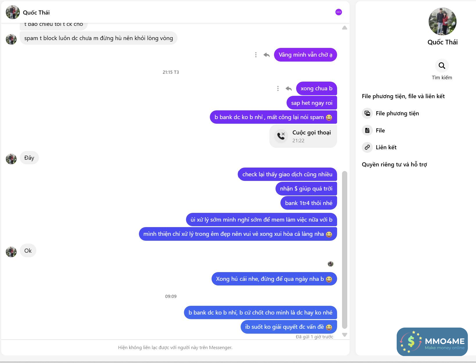 Đăng lên để cảnh báo anh em về bạn này trước khi làm việc chung, scam hơn 1tr bên mình , chính thức đã scam , thôi thì bài học vậy, các thông tin liên quan: