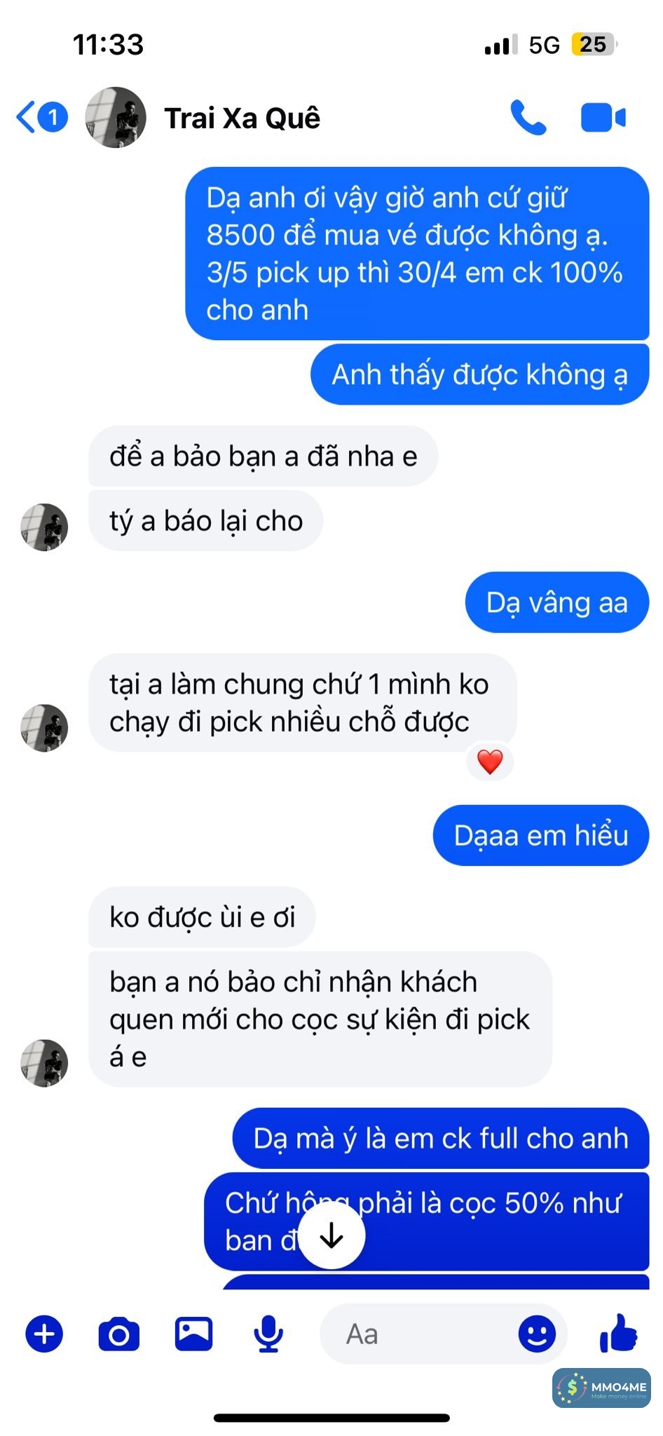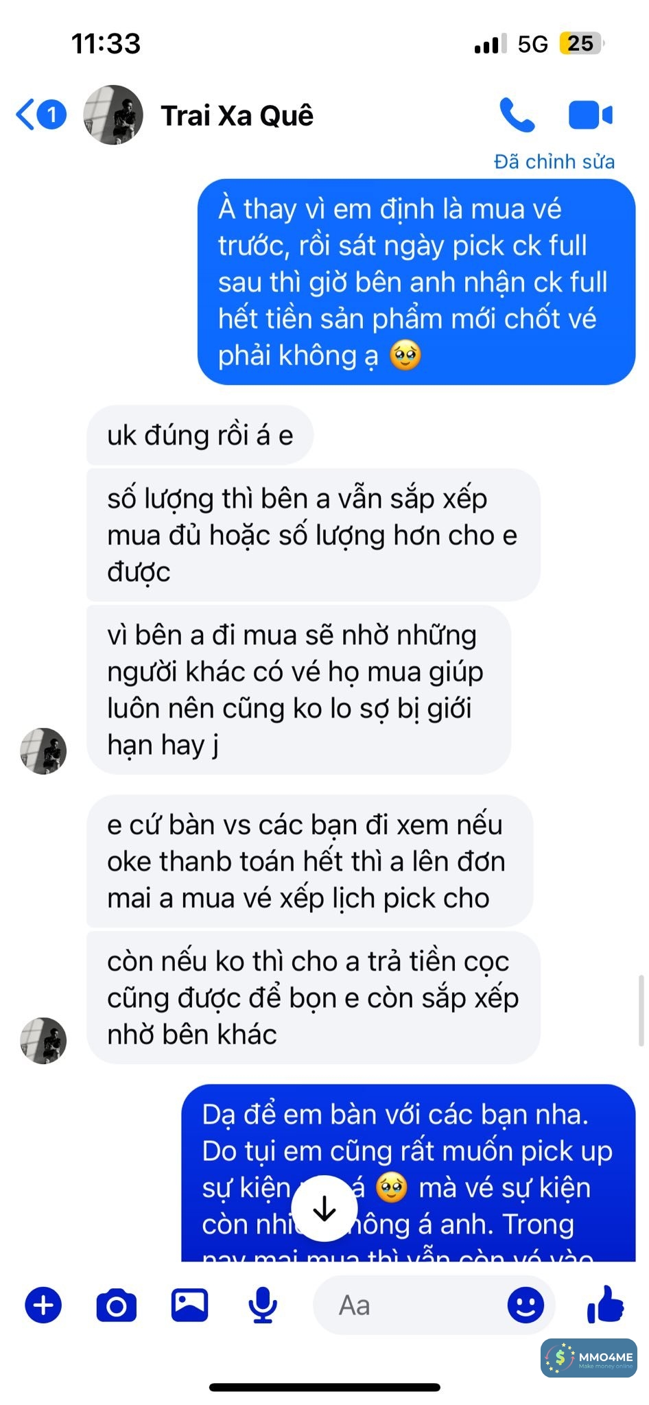 Ông này nhận pick up ban đầu nhận cọc 50% nên dịt đã cọc trước cho ổng 6m nhưng sau ổng báo lại là bạn ổng không nhận cọc cho sự kiện này nữa. Dịt có đề xuất là thanh toán trước tiền vé rồi tiền sản phẩm sẽ ckf trước ngày pick nhưng mà bên đó cũng hông chịu. Bây giờ chỉ nhận ckf trong tối nay để lên đơn chốt vé thôi. Nên có kêu dịt qua bàn bạc với mn trong group, k được thì hoàn cọc. Sau đó thì mn đặt nghi vấn, cảm thấy không an toàn nên muốn huỷ giao dịch. Ổng cũng oke và hẹn 9h rf. 9h30 dịt nhắn thì đã bị block. Chính thức bị scam