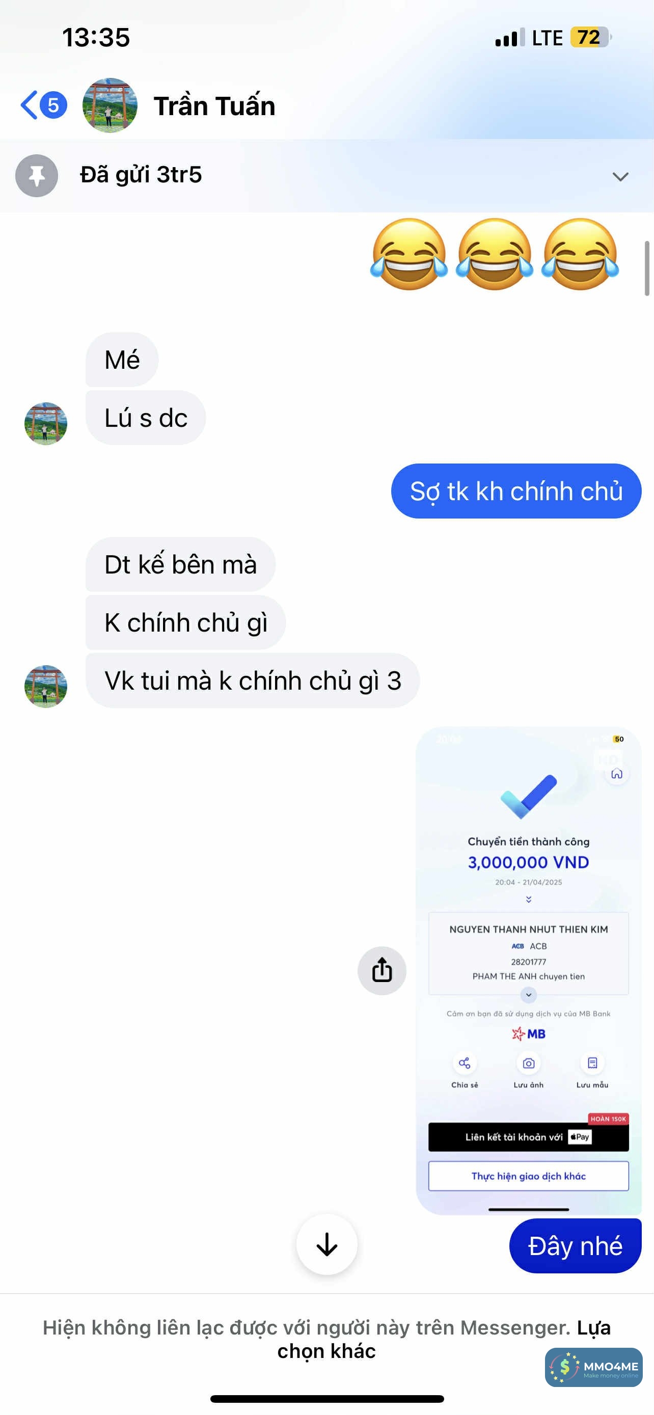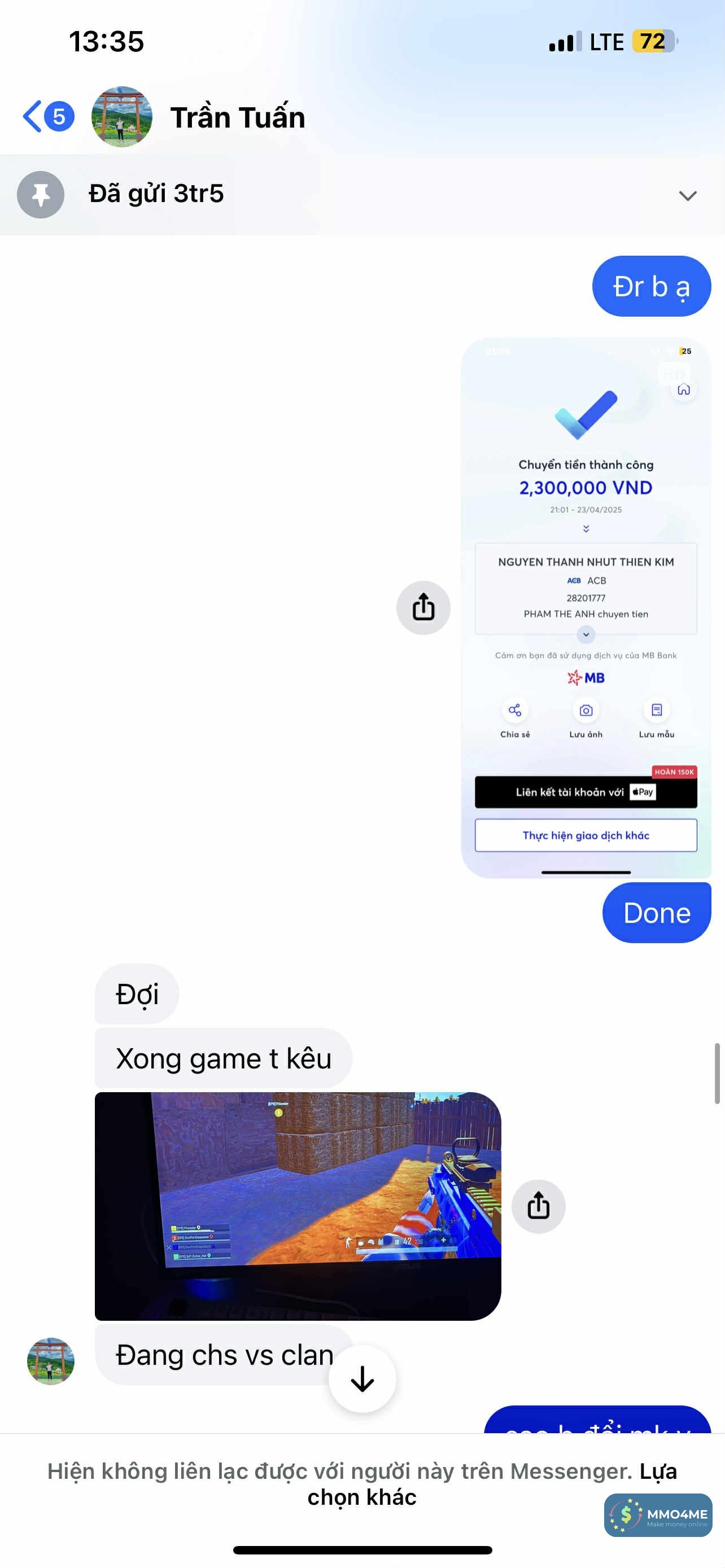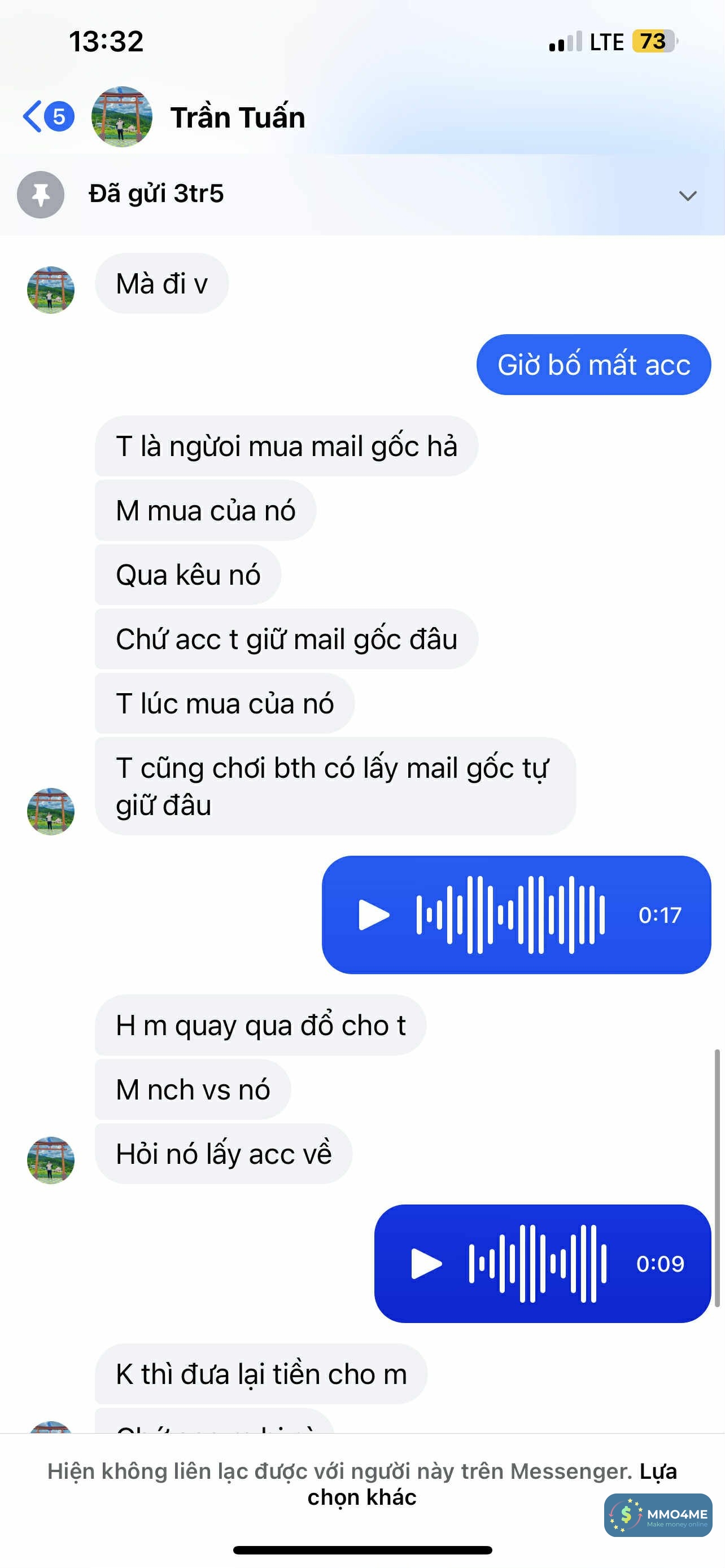 - đến ngày hôm nay tự nhiên mình không vào được acc nữa và tình trạng bị back lại mình có ib cho Thằng ( Mặt Lồl ) Trần Tuấn , thì nó lại bảo do giữa mình và Thằng Thuận ( BRYNUS SHOP ) kia gd với nhau nó không liên quan. Và trong lúc mua bán là mình chỉ biết mình gd với thằng ( Mặt Lồl ) Trần Tuấn .