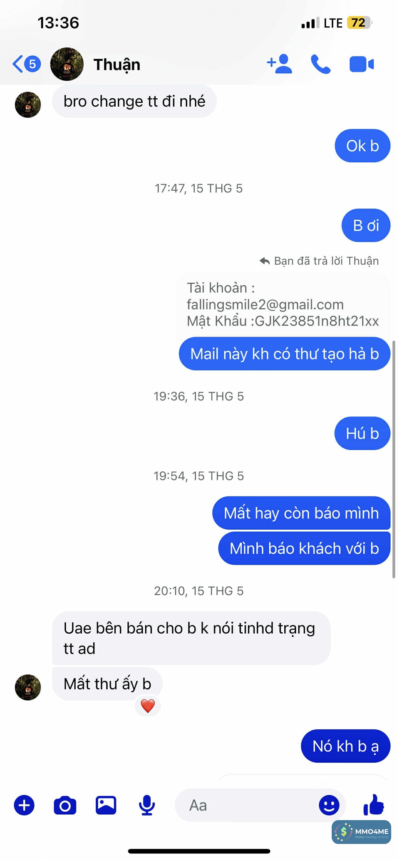 - Sau 1 thời gian mình chơi và mình có ý định bán acc thì tự nhiên mình nhờ check acc thì thằng Thuận (BRYNUS SHOP ) nó bảo mail mất thư . Và mình không bán acc nữa mình để chơi