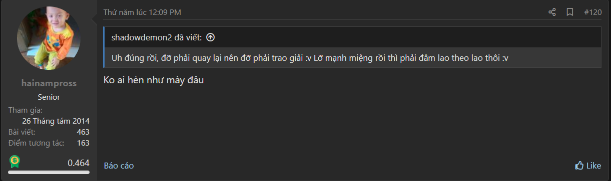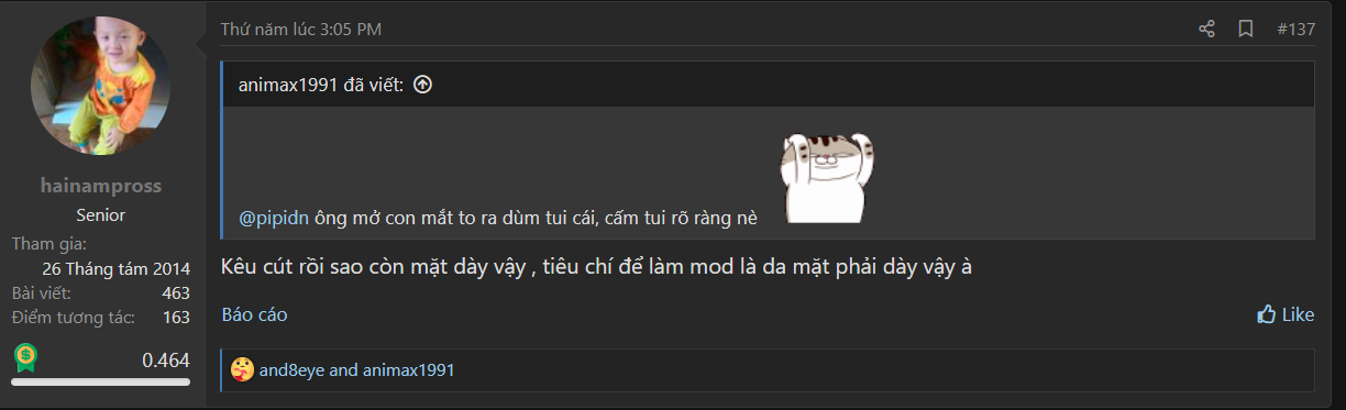 admin xem lại cái thằng này , chứ thấy nó toàn rình đi làm mấy trò này , riết rồi diễn đàn thành nói đấu tố , nó đào cmt từ thời nào để nó rp , rồi cái topic mod nói là xoá rồi ban vĩnh viễn thì nó cũng lôi vào , admin nên xử lý thằng này chứ để lâu thấy k ổn , từ 1 diễn đàn vui vẻ chia sẻ kinh nghiệm , giờ thành nói đấu tố nhau :popo_too_sad: :popo_too_sad: :popo_too_sad: :popo_too_sad: