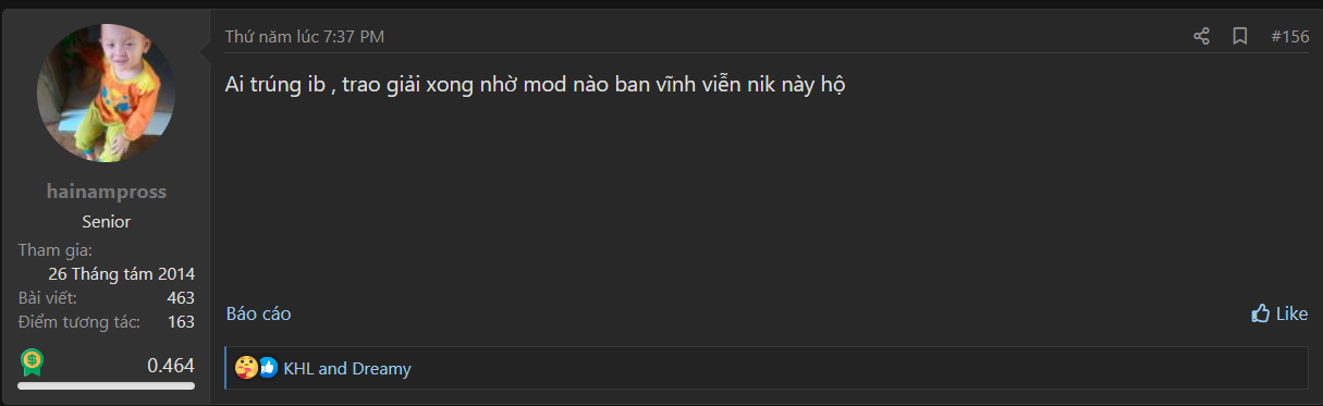 luật cái j , cái đó mod nhắn vào nói chuyện thì mình vào trả lời các cmt của mod thôi , mod cũng nói là xoá va ban vĩnh viễn khi evnet kết thúc , nhưng chả hiểu sao chưa xoá, thành phần toxic thì cứ rình đấu tố , riết rồi chả ai buồn chia sẽ nữa , k phải vì giải mà là vì nó k vui vẻ nữa :popo_too_sad: :popo_too_sad: :popo_too_sad: :popo_too_sad: , mong admin sáng suốt thôi