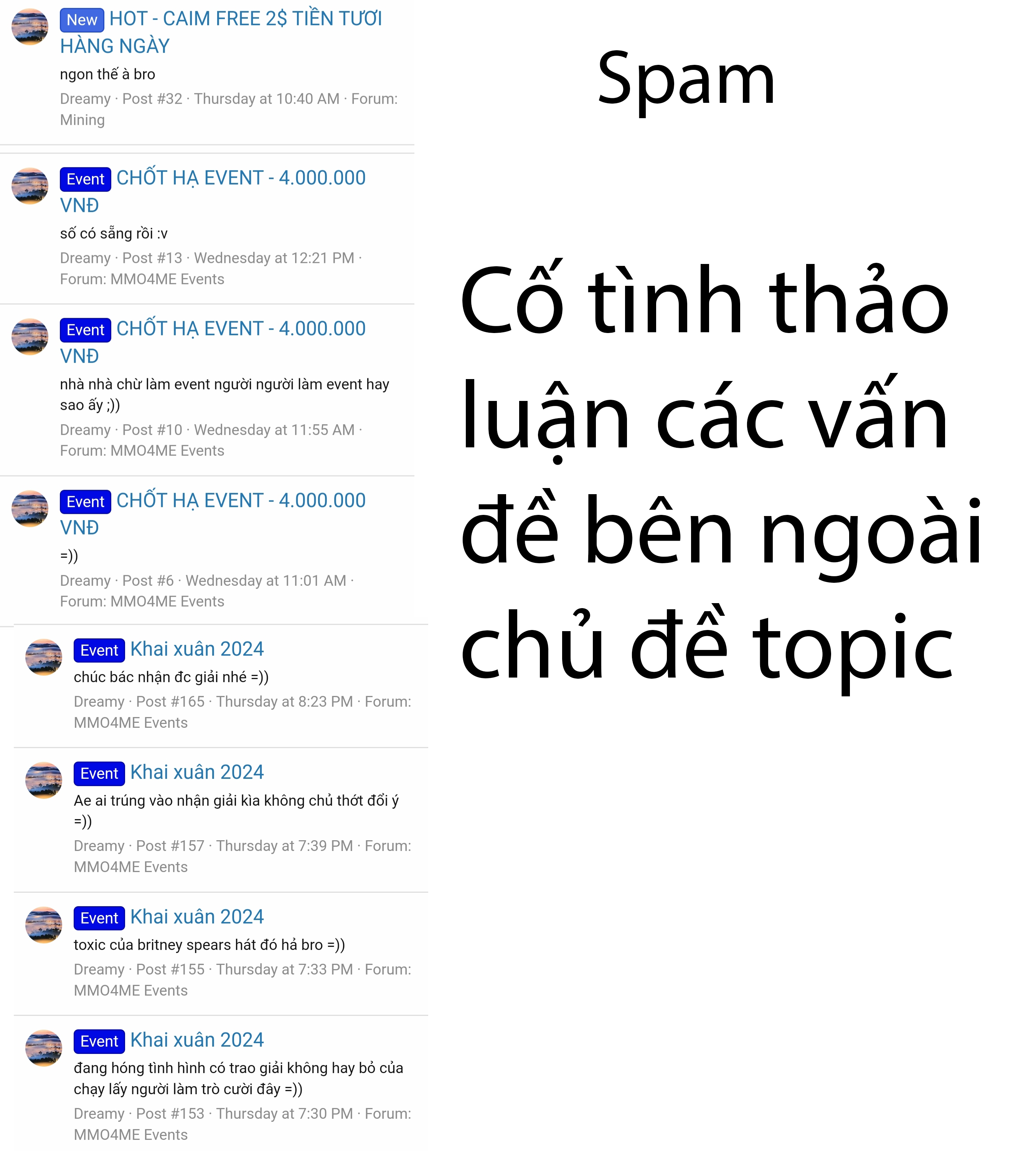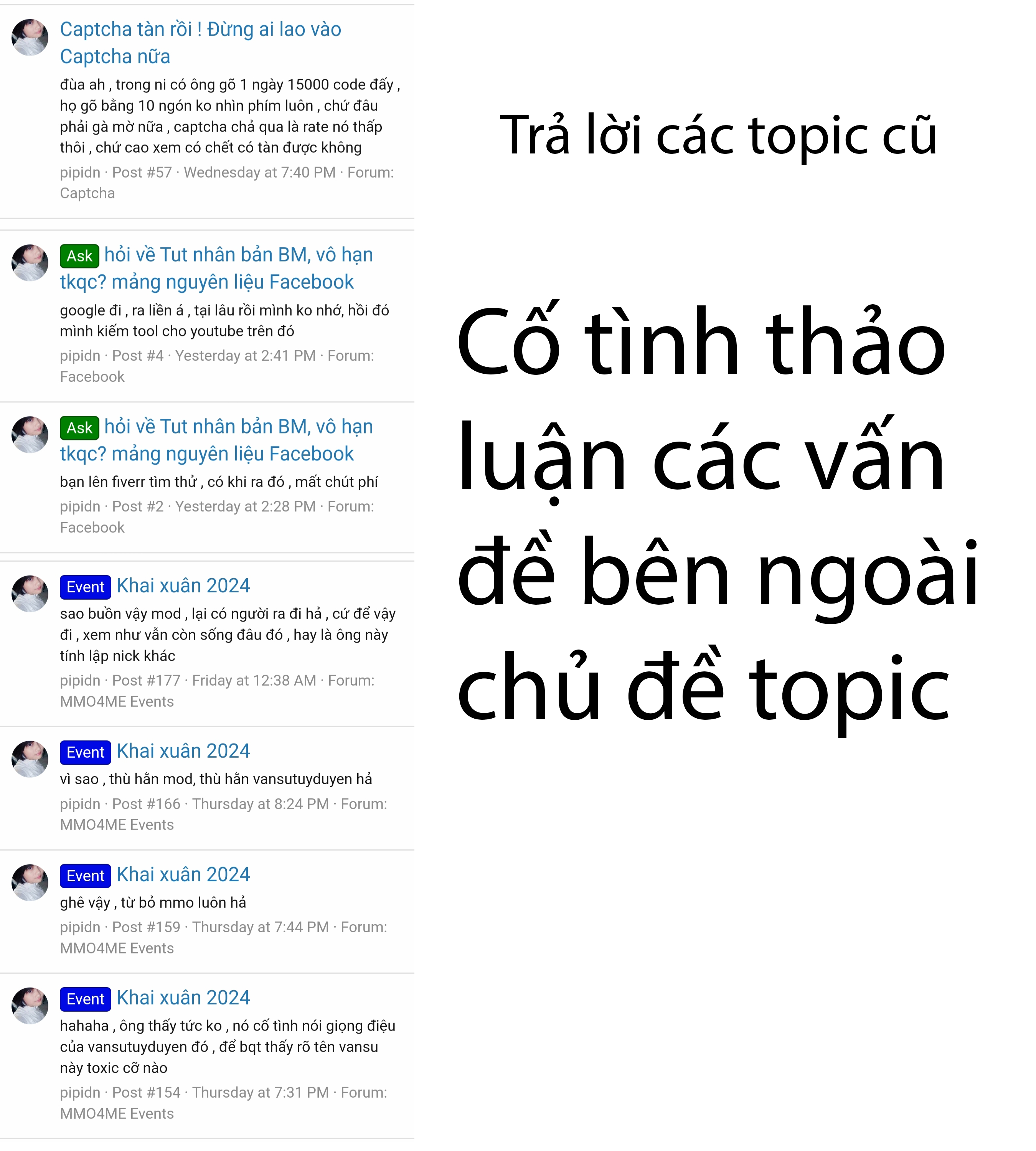 • Không có giá trị cho chủ Topic: bàn ra khỏi chủ đề của Topic, gây hoang mang, khó hiểu cho chủ Topic và những người khác, ...