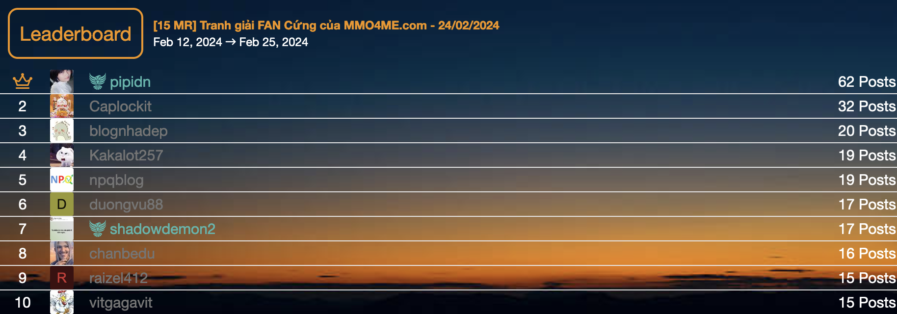 FAN cứng là gì, đó là những người thường trực và cống hiến rất nhiều bài viết cho ngôi nhà MMO4ME của chúng ta. Chúng ta cũng rất thắc mắc đó là những ai đúng không? Thì với chương trình này, chúng ta sẽ tìm được họ sớm thôi.
