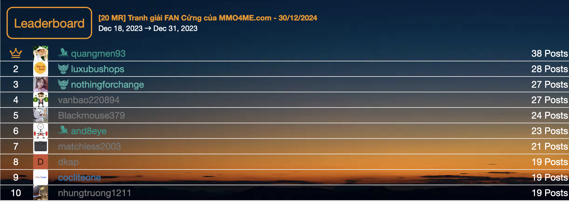 FAN cứng là gì, đó là những người thường trực và cống hiến rất nhiều bài viết cho ngôi nhà MMO4ME của chúng ta. Chúng ta cũng rất thắc mắc đó là những ai đúng không? Thì với chương trình này, chúng ta sẽ tìm được họ sớm thôi.