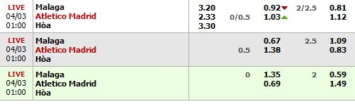 Ở đây kèo 0/0.5 tức = 0.25 : kèo này chỉ ra là nếu nằm đội chấp ( Aletico ) hòa thì sẽ bị thua nửa tiền, thắng thì ăn cả, thua thì thua cả và ngược lại nằm đội được chấp (Malaga ) nếu hòa thì ăn nửa tiền, thắng ăn cả và thua thua cả