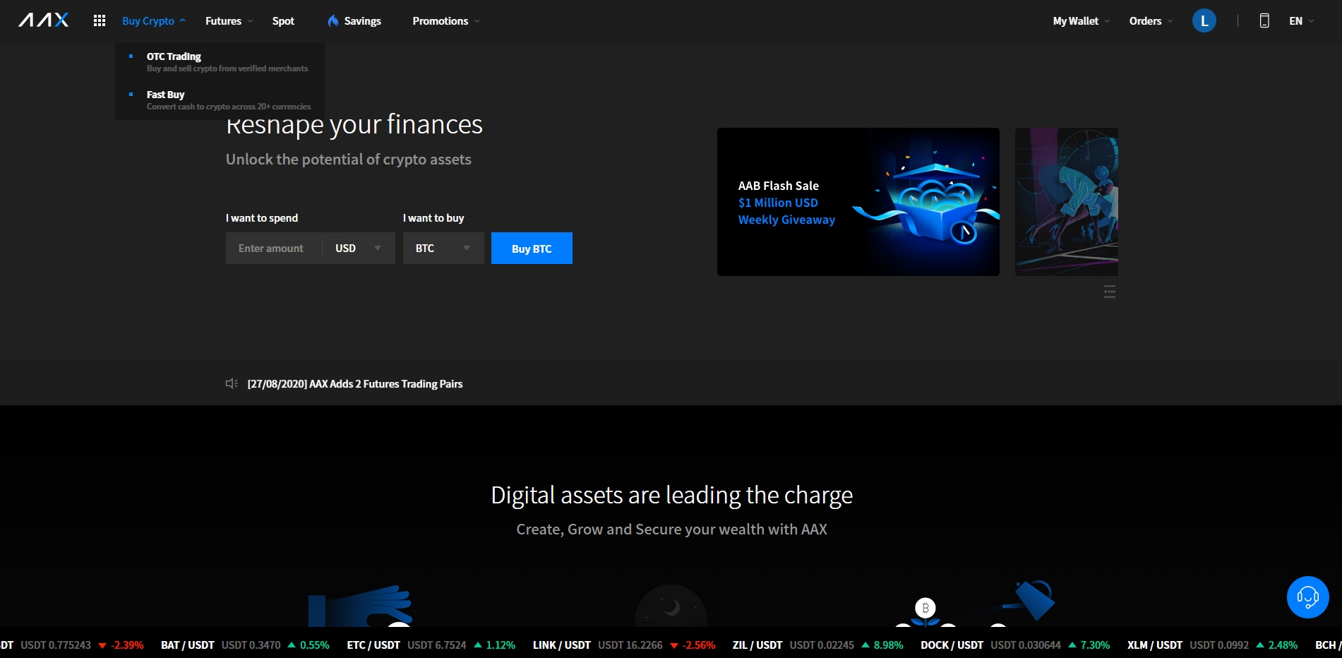 AAX.COM là sàn đến từ Trung Quốc, Thời điểm viết bài thì nó đang xếp hạng thứ 55 tại Coinmarketcap và 104 tại Coingecko theo thứ hạng tổng khối lượng giao dịch trong ngày. Sàn – cung cấp đầy đủ các tính năng mà người dùng mong muốn: mua bán OTC, spot trading, future trading.