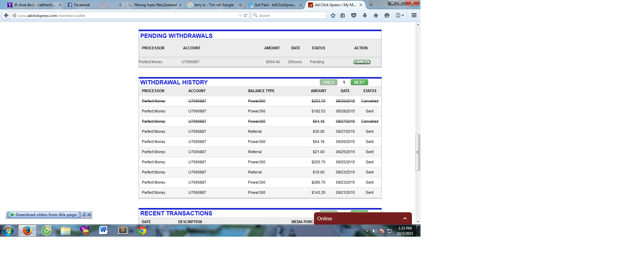 muốn thấy thì đây , trước khi xài từ " chém " thì phải biết người ta có nói đúng hay ko nha , có 2 lệnh hủy ngày 27 vì rút 64$ ít nên hủy để rút cho thành 1 cục 192$ , ngày 30 cũng vậy , nên chờ coi lệnh rút 500$ khi nào về rồi biết nha . Những lệnh trước đó trong vòng 2 ngày là có , có cái 25 về rồi 26 cũng về View attachment 62211