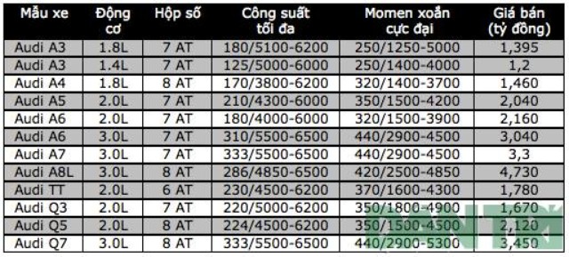 Bảng giá AUDI đây, mất bác cứ theo đó để tái rước audi nào :D