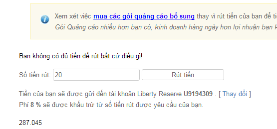 sao mình có 20$ trong wallet mà không rút được nhỉ View attachment 21304 đây là khi vào my walletView attachment 21306 sau khi ấn withdrawView attachment 21307 View attachment 21308 sau khi điền 0$ ( minpay) để rút...View attachment 21309 nó báo không đủ tiền mới điêu chứ.. :binhsua43: