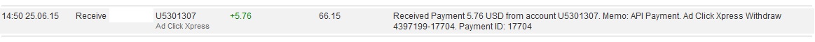 The amount of 6.62 USD has been deposited to your Perfect Money account. Accounts: U5301307->U6xxx. Memo: API Payment. Ad Click Xpress Withdraw 211586-18047.. Date: 13:29 26.06.15. Batch: 93008958