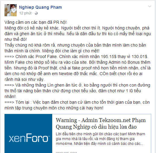 Vậy là proof fake giảm xuống hả bạn? Ổng làm thế chi nhỉ. Để số 195$ nhìn thích hơn chớBiết ngay mà người ta dc admin pay cho 195$ ông ấy sợ Proof to quá nên fake xuống 130 vừa khớp số liệu vừa làm giảm Proof to các bác k biết gì cứ Gato rồi report người ta bỏ cái thói đó đi nha