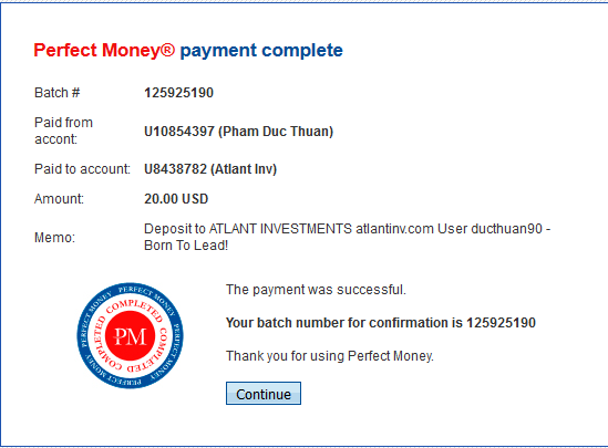 The amount of 20 USD has been withdrawn from your Perfect Money account. Accounts: U10854397->U8438782. Memo: Shopping Cart Payment. Deposit to ATLANT INVESTMENTS atlantinv.com User ducthuan90 - Born To Lead!.. Date: 00:44 04.04.16. Batch: 126611264.