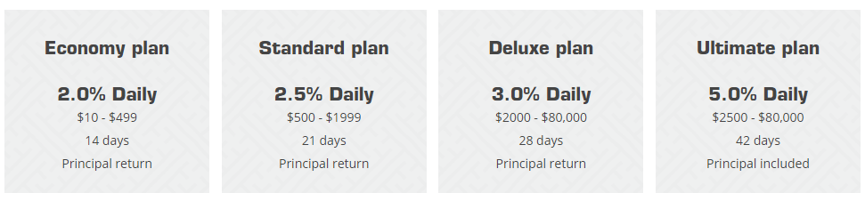 Có các plan sau: Vốn sẽ được gửi lại khi hết số ngày deposit tùy mỗi gói.