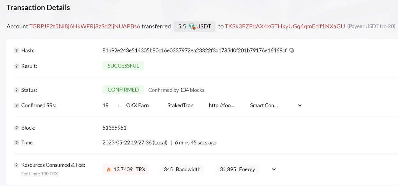 8.00 has been successfully sent to your Tether TRC20 account *.