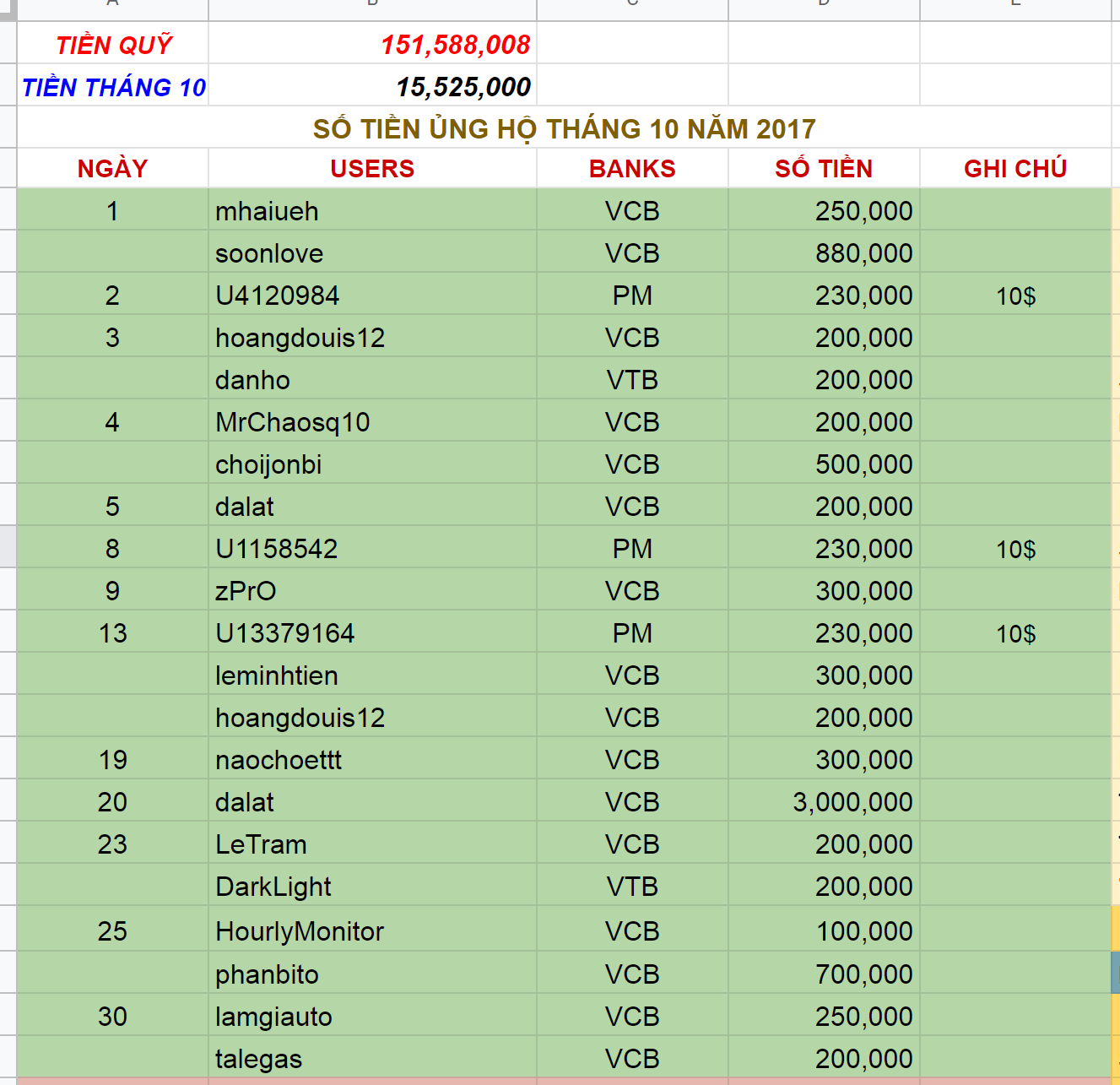 Tổng tiền quỹ đã nhận được trong tháng 10 là 15,525,000 (Mười lăm triệu năm trăm hai mươi lăm ngàn đồng) là sự đóng góp và ủng hộ của các MTQ trong và ngoài forum,
