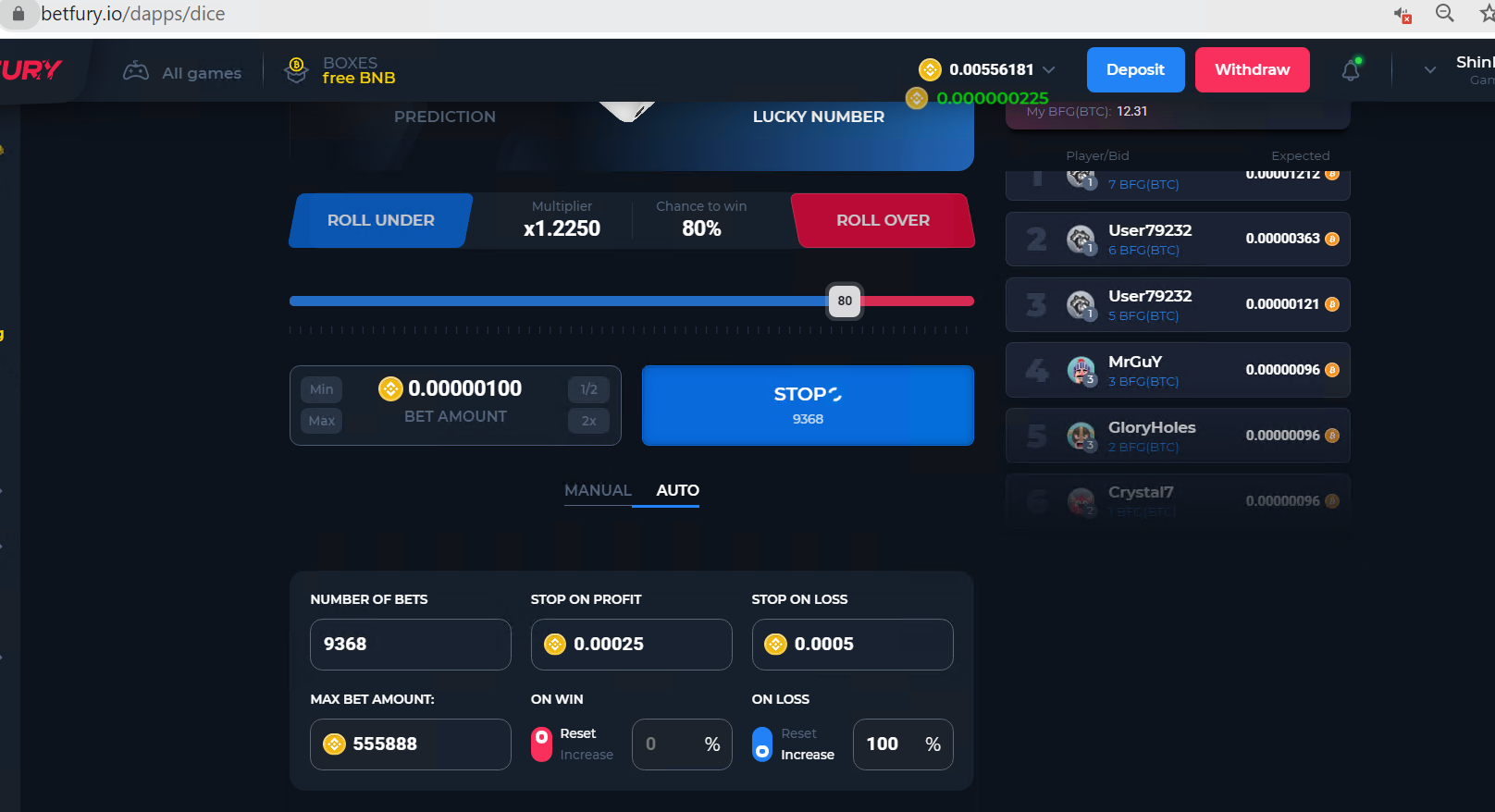 Em muốn nạp 1 chút tiền vào để có BNB , sau đó dùng BNB *** lấy BFG (BTC).Bác collect dc BNB thì bác chơi dice dc rồi. Min *** nó là 0.00000001 BNB mà. Chơi dice BNB và BTC thì bạn sẽ đào dc BFG (BTC) .Còn BFG (Trx) thì bạn phải nạp tiền hoặc khi nào bạn có trên 10 token BFG(BTC) nó sẽ trả lãi trong đó có BTC,BNB,BTT,Trx,USDT từ đó bạn *** bằng "BTT,Trx,USDT" thì sẽ đào dc BFG (Trx).
