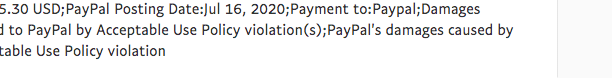 $ 1xx,26 USD; Ngày đăng PayPal: 15 tháng 4 năm 2021; Thanh toán cho: Paypal; Các thiệt hại của PayPal gây ra do vi phạm Chính sách sử dụng được chấp nhận ;.