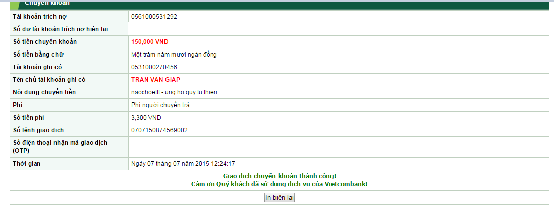 • VCB: 0531000270456 - Trần Văn Giáp