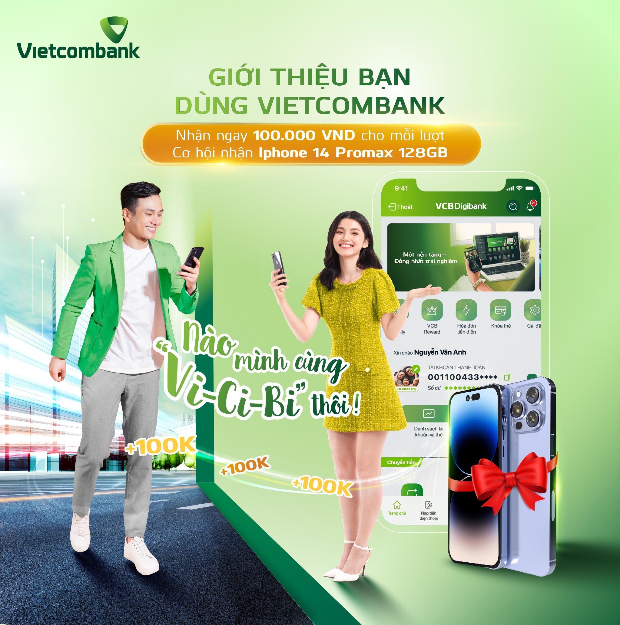 - Tặng ngay 100.000 VND/lượt giới thiệu khách hàng kích hoạt VCB Digibank thành công và phát sinh giao dịch tài chính từ 200.000 VND. Không giới hạn giới hạn số lượng giới thiệu và số tiền thưởng.