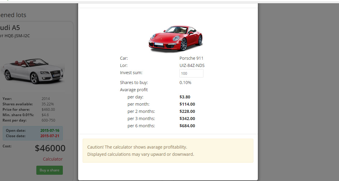 - Xe 2:Là xe của cty dùng để cho thuê.Ta sẽ thu hồi lại vốn sau 2-3 tháng.Sau đó sẽ thu được lợi nhuận từ 2-3 năm tiếp theo (có thể bán lại cổ phần sau 20 ngày nhưng bị phạt. mức phạt nhứ sau: 20 ngày – 30 ngày 20% – 15%, 45 ngày – 60 ngày 10% – 5%, 90 ngày – 0%)