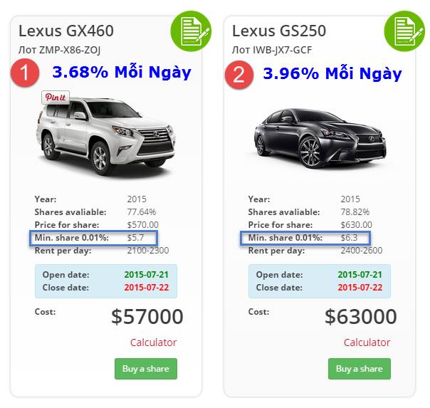 Hiện có 2 xe ngon: Lambo Aventador 0.01%=39.15$ , lãi 3.55% mỗi ngày và chiếc Porsche 911 lãi 3.68%/ngày Min dẹp: 10.3$ có 0.38$/ngàycần bao nhiu tiền mới tham gia được vậy thớt
