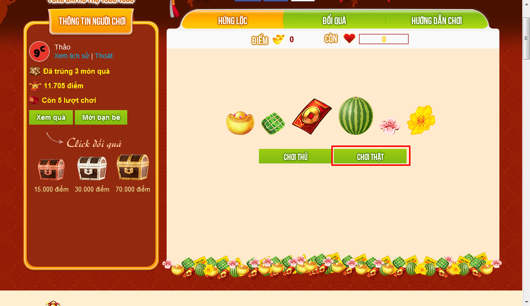 3. Bấm nút Chơi thật trong cửa sổ Game, đợi 1s sau đó chạy file .js bạn vừa tải hoặc vừa Copy về
