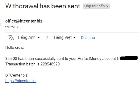 The amount of 35 USD has been deposited to your account. Accounts: U17727991->U****. Memo: API Payment. Withdraw to crow from BTCenter.biz.. Date: 13:14 13.09.18. Batch: 228216425.