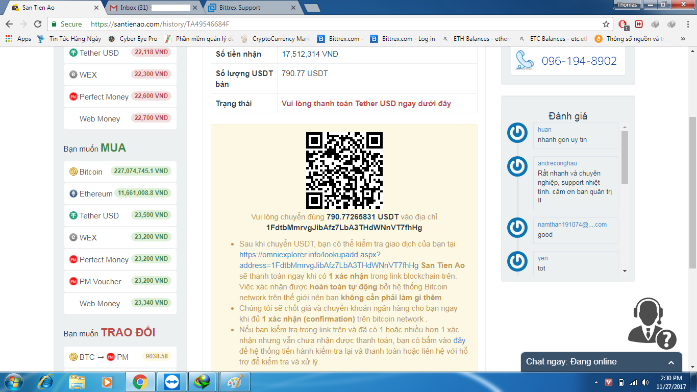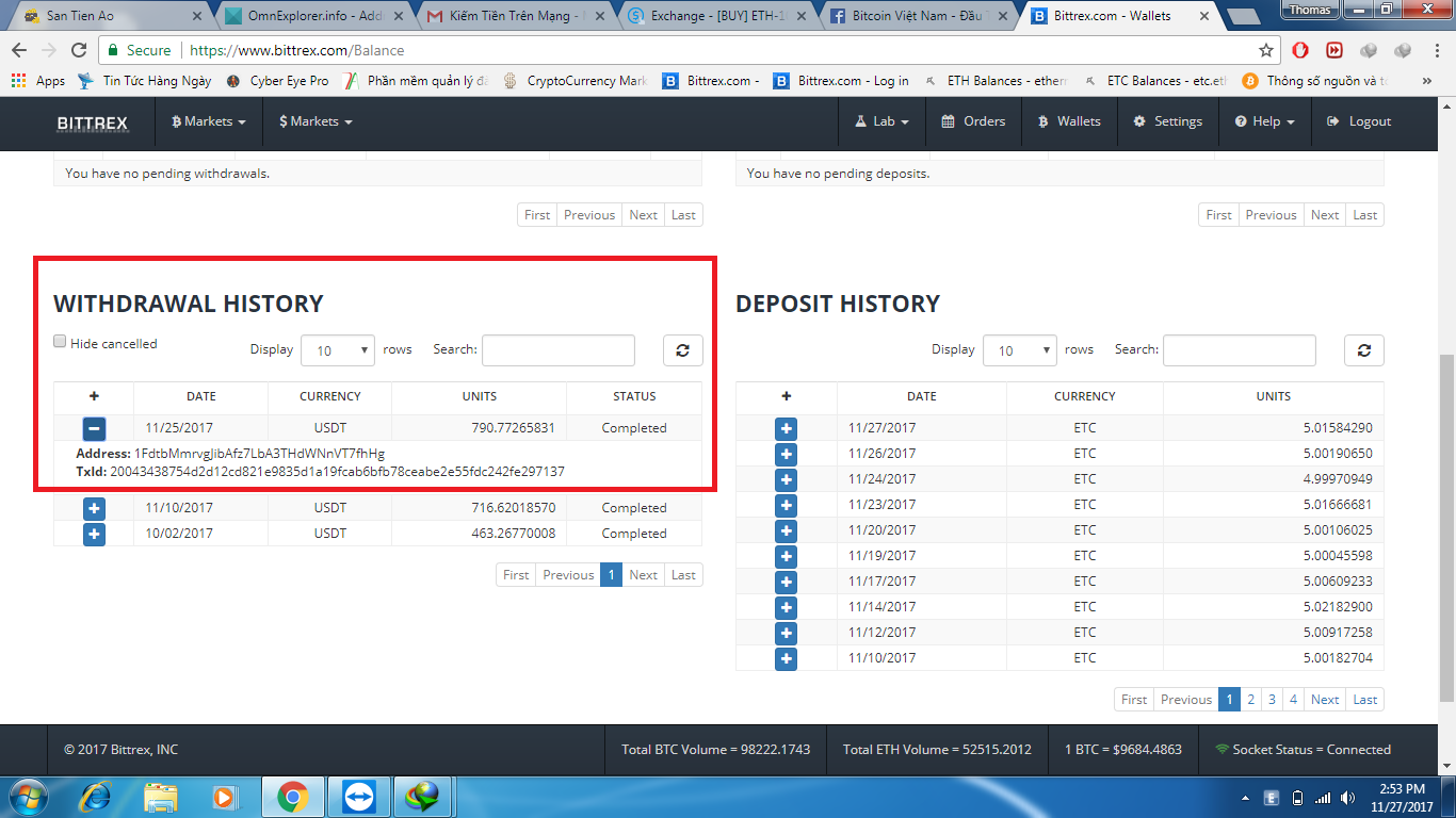Ngày 25/11/2017, mình có giao dịch bán USDT với sàn tiền ảo, tổng giá trị là 790,77 usdt. Mình đã thực hiện chuyển số tiền trên về ví theo thông báo, hướng dẫn của STA. Tài khoản Bittrex của mình cũng đã trừ tiền và xác nhận hoàn tất giao dịch. Tuy nhiên, đến nay là ngày thứ ba mình vẫn không nhận được tiền chuyển vào tài khoản. Kiểm tra trên link OmniExplorer theo địa chỉ ví của STA cung cấp thì thấy trống trơn, không có bất cứ giao dịch nào; ngoài ra Omni còn hiện thông báo là địa chỉ ví này lần đầu tiên được thấy. Mình so sánh, đối chiếu ví do các bạn đề nghị chuyển và ví mình đã chuyển đến thì đúng, khớp (mình nghi ngờ là ví STA do phần mềm cung cấp tự động bị sai)