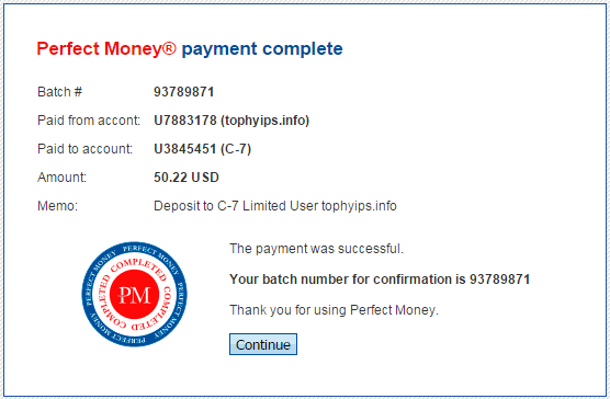 The amount of 50.22 USD has been withdrawn from your Perfect Money account. Accounts: U7883178->U3845451. Memo: Shopping Cart Payment. Deposit to C-7 Limited User tophyips.info.. Date: 02:44 04.07.15. Batch: 93789871.