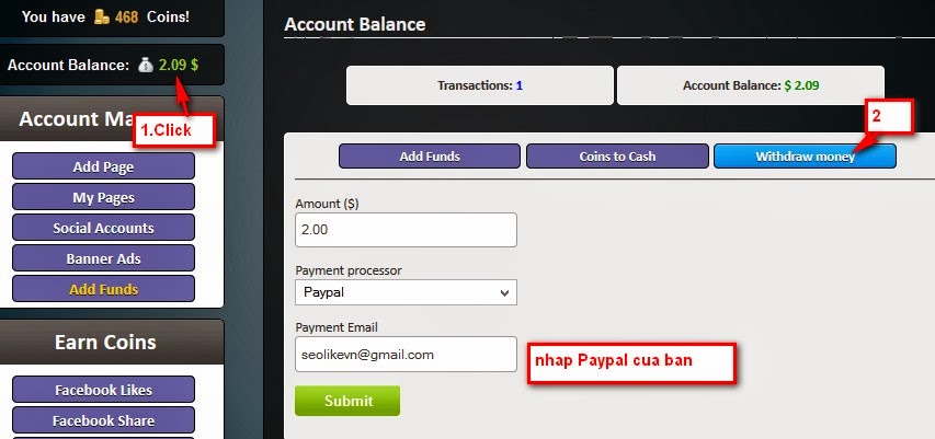Như mục đích của Coins thì nó để dành cho những người muốn tăng like cho page. Nhưng đối với những người không có thời gian like thì họ có thể mua. Và chúng ta có thể bán cho họ.Hoặc chúng ta có thể chuyển Coins sang tiền mặt để rút về. tại GetAutoLike thì họ mua 1$ với 2000 coins