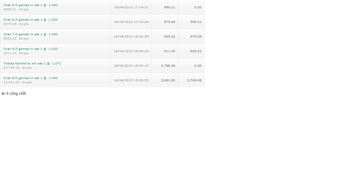 À mình xác định chơi kèo tennis khi có tỉ số 4-1 4-2 5-2 5-3 thì *** thằng dẫn thắng hoặc under 12.5 game in set ^^