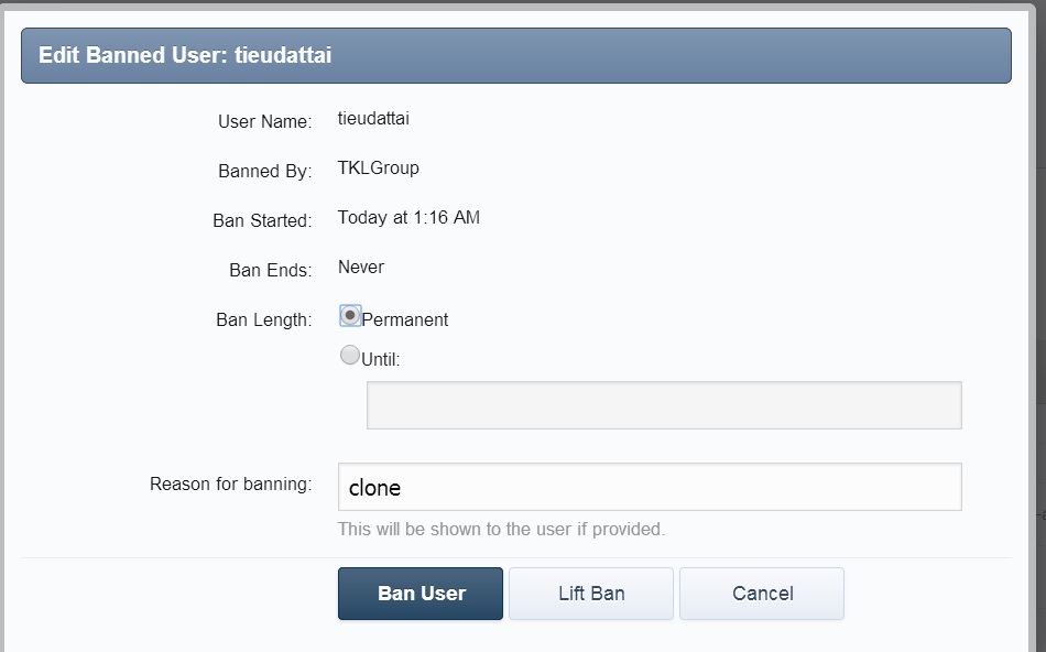hình như càng ngày anh em càng xem thường rule của forum đã clone mà còn tự nhận là mình clone quá xem thường rule của forum ,không thể chấp nhận việc clone nick gây war nói năng tục tĩu ,rồi sau đó lấy nick chính vào thì nhẹ nhàng,mình sẽ đề nghị shin thêm luật ,nếu phát hiện account clone thì ban ngay còn account chính cũng sẽ bị ban ít nhất 1 tháng nặng nhất là forever ,tội lừa đảo ,lách luật ,hy vọng anh em nên tôn trọng luật forum , mình đã sửa lại nick tieudattai là ban forever do clone .close topic tại đây
