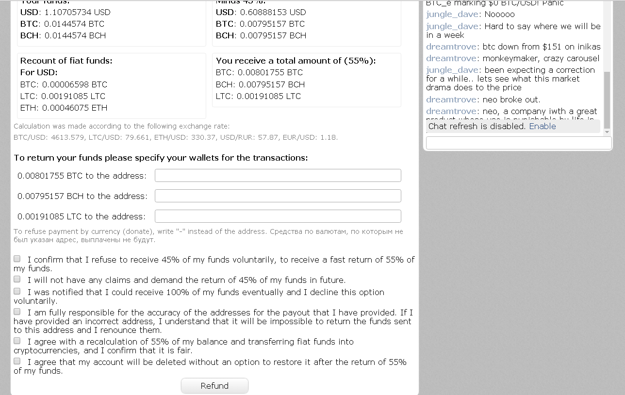 Cập nhật 02:38 03/09/2017: https://btc-e.nz/refund Dành cho những bạn nào cần rút ngày 2/9. Rate refund các coin được cập nhật liên tục theo rate thị trường.