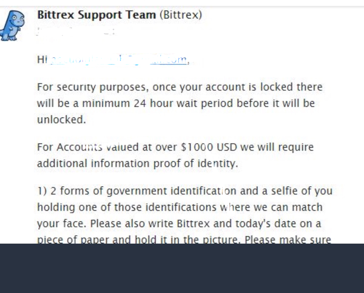 Dịch tạm là khoá acc có 2 lý do, 1 là bạn tự lock do ip lạ login , 2 là tài khoản có giá trị trên 1k nó cần tài liệu nhận dạng nên khoá.Cần 2 bằng chứng nhận dạng, hộ chiếu,cmt,or bằng lái xe và 1 bức selfie cầm tài liệu, ko gửi cho nó thì cứ lock thế