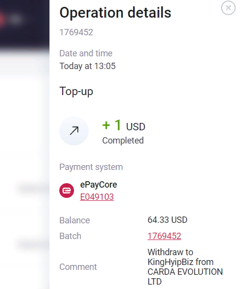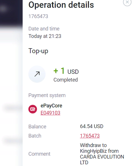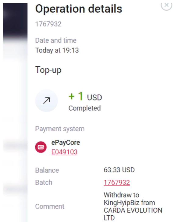 Comment: Withdraw to KingHyipBiz from CARDA EVOLUTION LTD