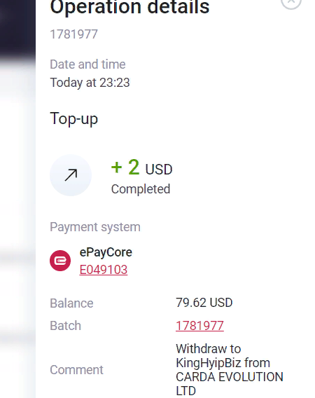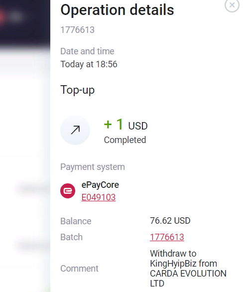 Comment: Withdraw to KingHyipBiz from CARDA EVOLUTION LTD