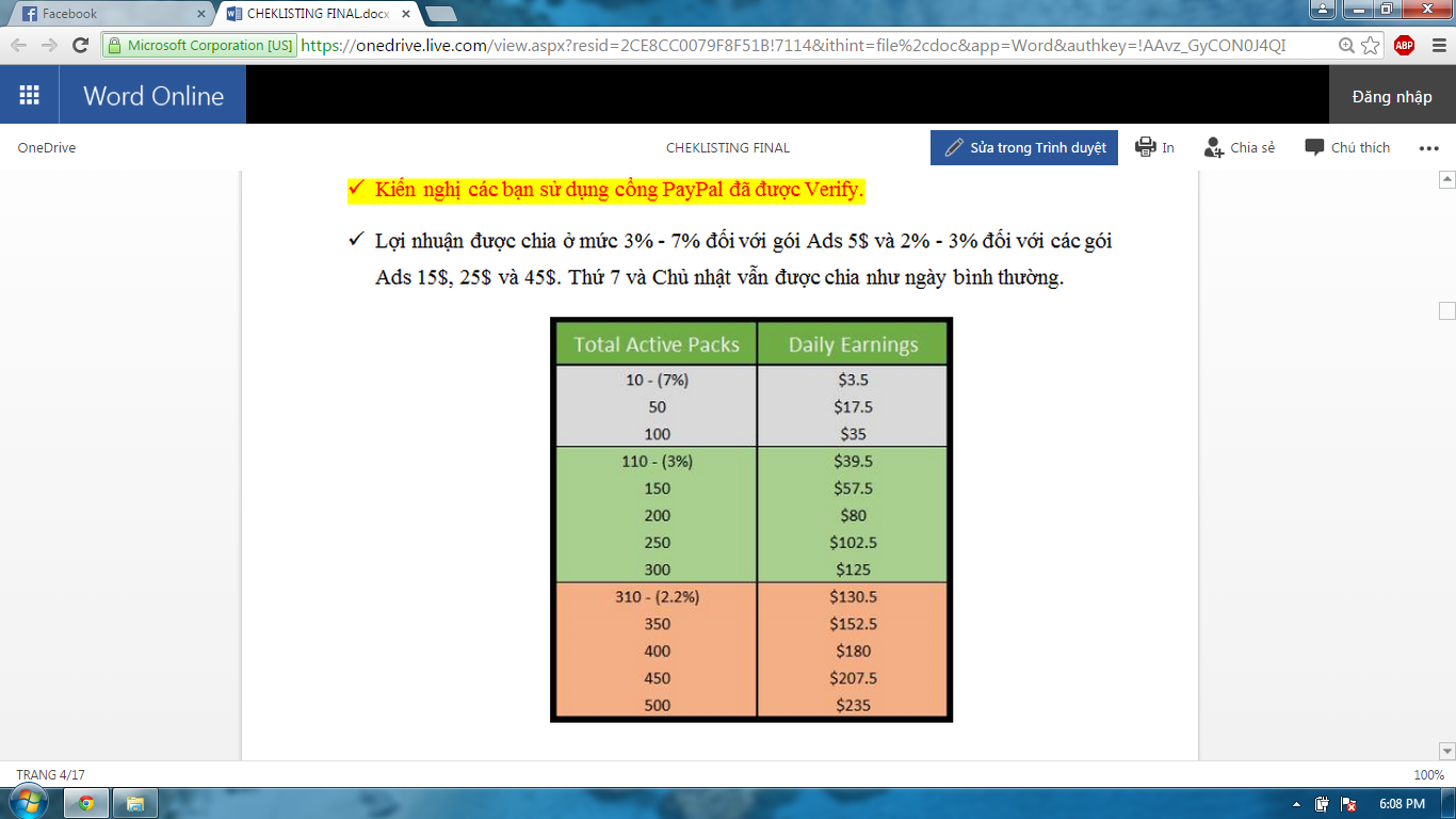 Đó là trước đây còn bây h lãi giảm rồi bạn ạ. Cột trái là số lượng ads bạn mua. Cột phải là tiền mỗi ngày nhận đc ứng với số ads đó. 3 dòng đầu là gói 5$. Với 10 gói 5$ thì bên phải là số tiền mỗi ngày bạn nhận. Mấy hàng sau là gói 15$,25$ và 45$. Lãi hiện tại gói gói 5$ là 5% các gói còn lại 2,8% gì đó.