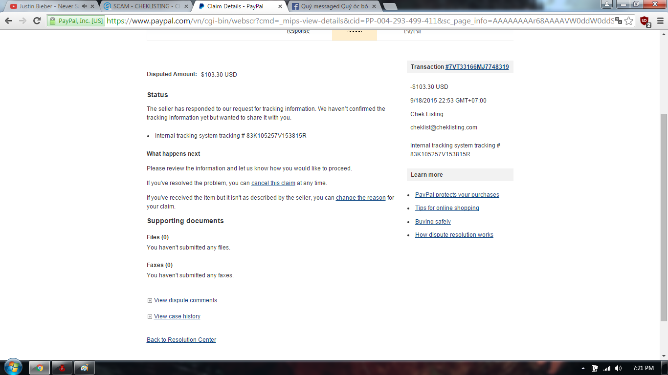 Awaiting other party's responsePayPal requests more information from the seller to resolve the issue. If the seller doesn't respond within 10 days, we close the case and restore funds to the rightful owner.