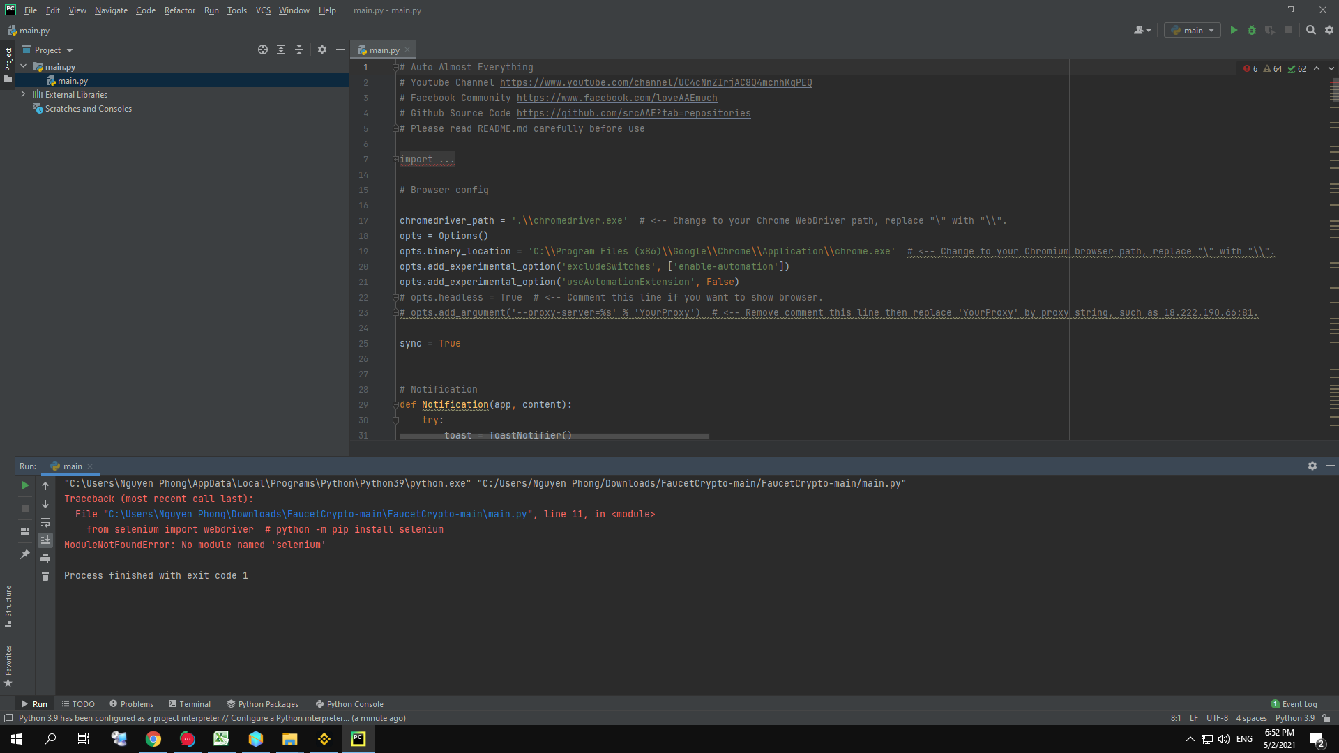 Đối với trường hợp này, bác đã set môi trường python là môi trường ảo trong project thay vì hệ thống. Bác bấm vào chữ selenium và webtoaster có dấu đỏ phía dưới, bấm ALT+Enter, sau đó chọn cài đặt. Để nhanh cho bác, sẵn tôi đang rảnh, Teamview đi bác.